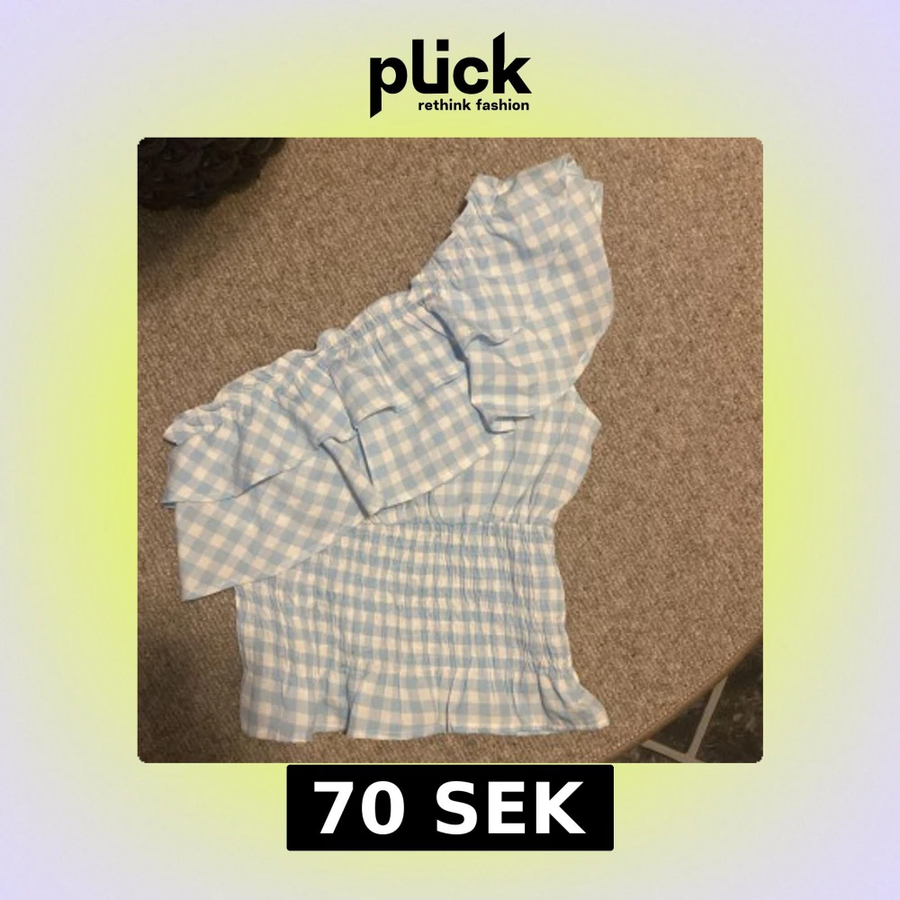 Säljer en söt blåvit rutig topp från Boohoo med volang och one shoulder-design. Toppen har smockad midja och ett härligt somrigt mönster. Perfekt för dig som gillar unika detaljer och fräsch stil!