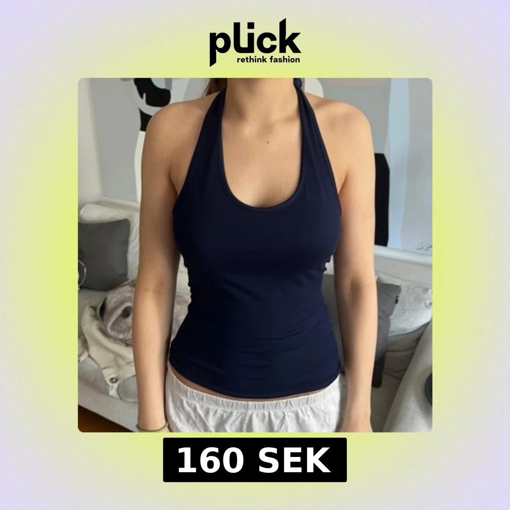 Snygg mörkblå halterneck linnetopp med knyt i nacken. Toppen är tight och figurnära med djup urringning och slät yta. Perfekt för dig som gillar enkel men stilren look.