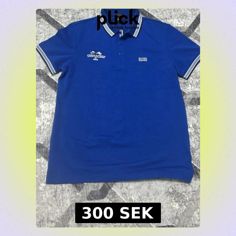 Snygg blå pikétröja från BOSS med vit logga på bröstet och kontrasterande vita detaljer på krage och ärmslut. Klassisk polokrage med knappar och korta ärmar. Perfekt för en stilren och sportig look.