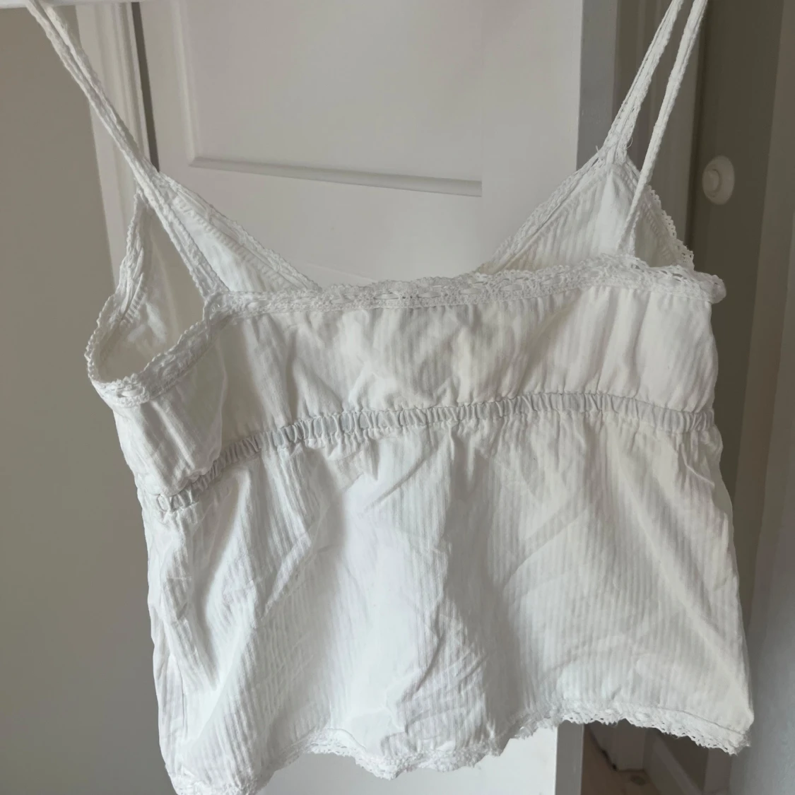 Säljer en söt vit linnetopp från Brandy Melville med tunna axelband och spetsdetaljer. Jättefint skick. One size men typ S/M