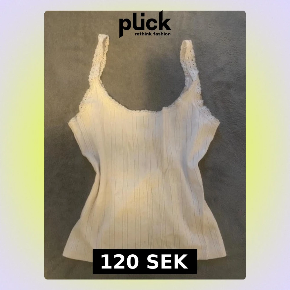 Säljer en söt vit linnetopp med tunna axelband och spetsdetaljer längs kanterna. Toppen har ett diskret randigt mönster och är figurnära med en feminin touch. Perfekt för dig som gillar romantisk och enkel stil.