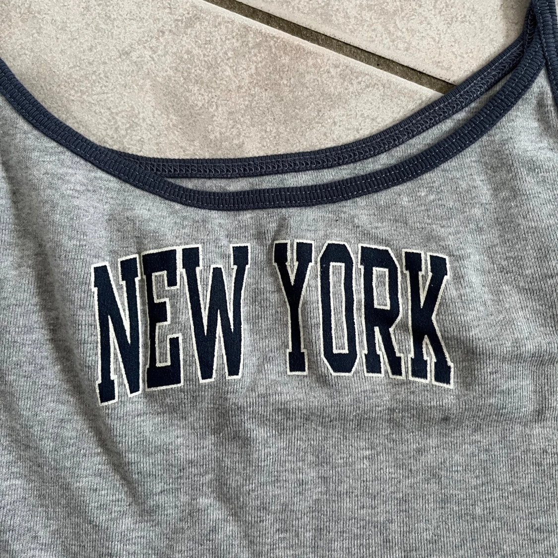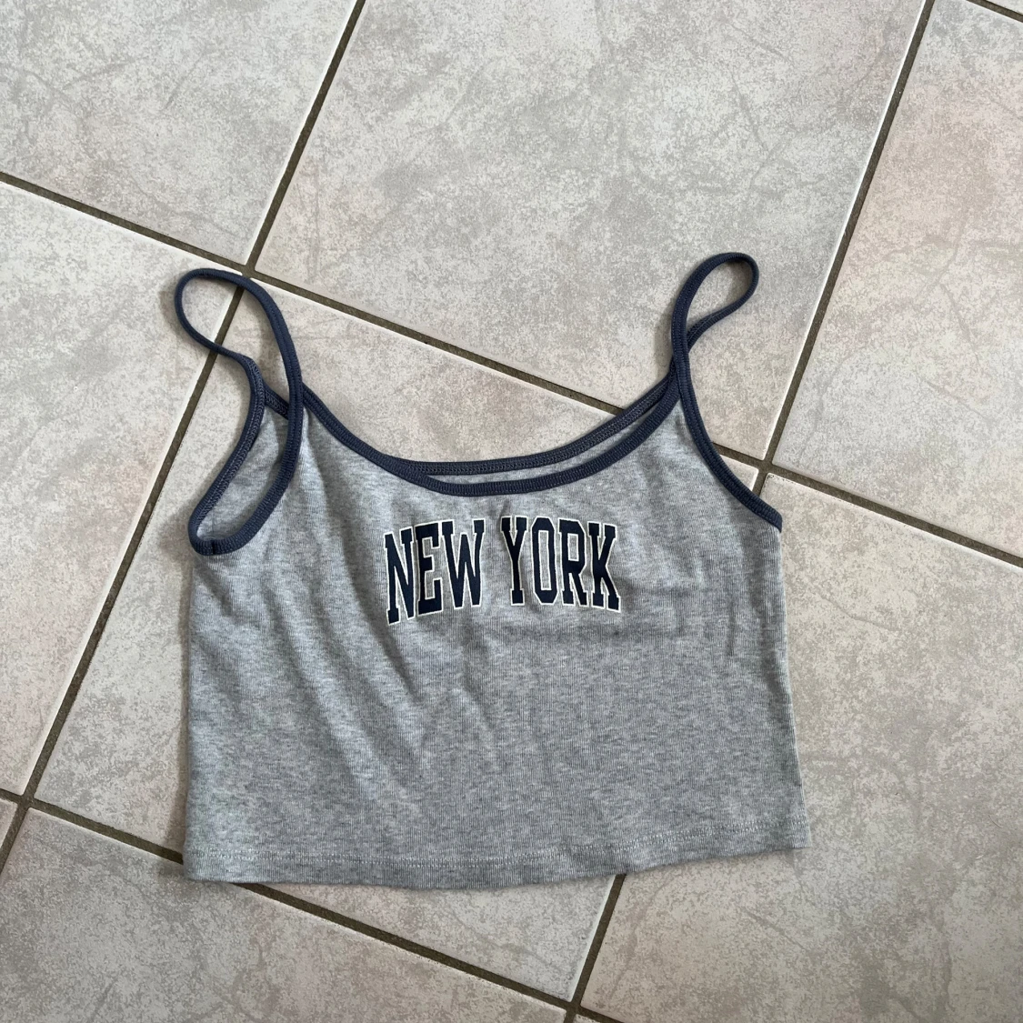 Säljer en grå linne från brandy Melville med ett coolt 'New York'-tryck på framsidan. Den har mörkblå kantdetaljer och är perfekt för en avslappnad stil. Tillverkad i 100% bomull, vilket gör den superbekväm att bära. skriv vid frågor💗