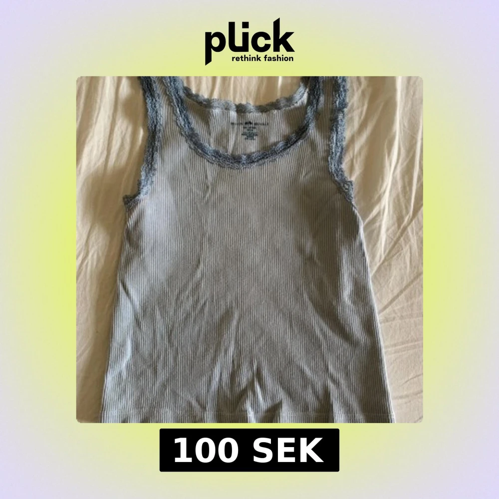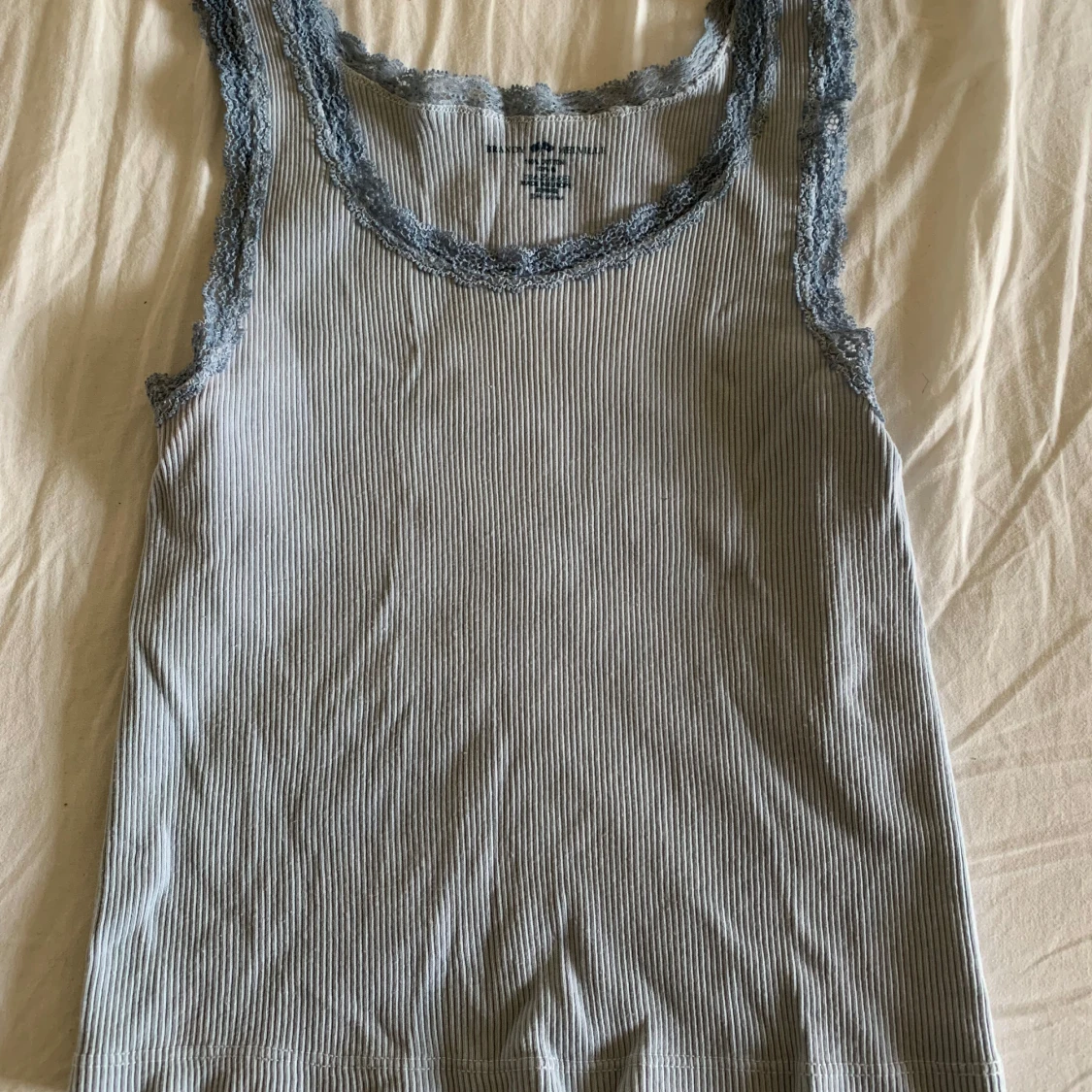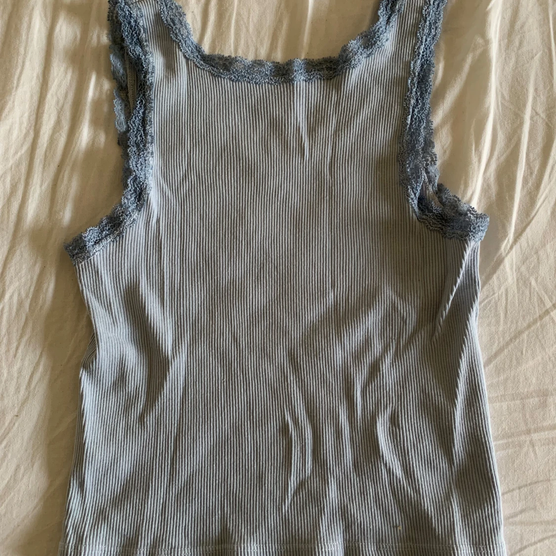 Supersöt ljusgrå och vit randig linnetopp från Brandy Melville. Toppen är ribbad och har fina spetsdetaljer i grått längs urringning och ärmhål. Perfekt att styla med jeans eller kjol för en chill look.