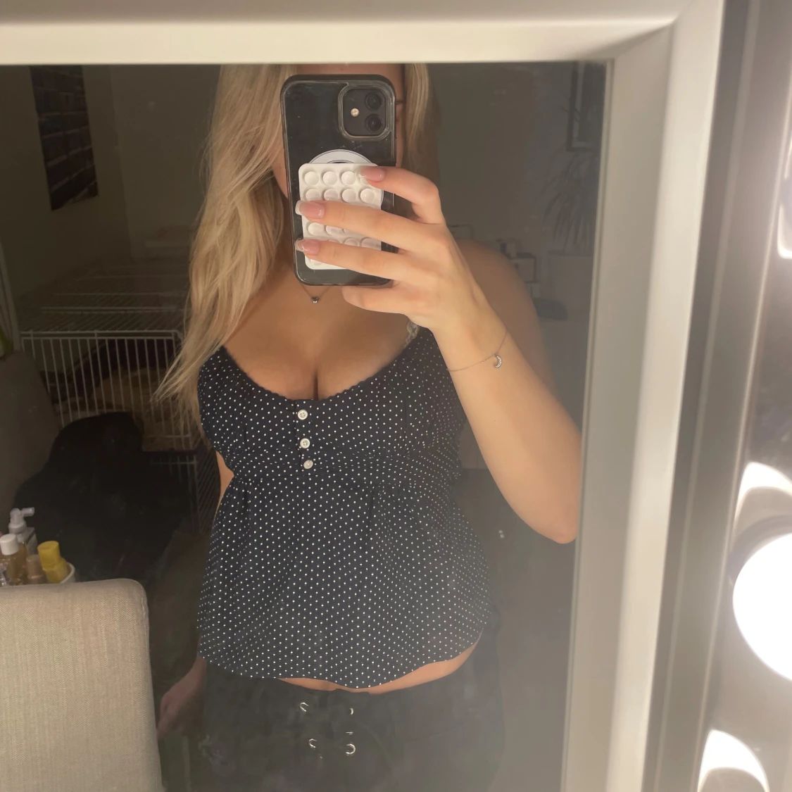Säljer en svart linnetopp med vita prickar och tre dekorativa knappar framtill. Toppen har v-ringad urringning. Den har one size men passar mig som har s