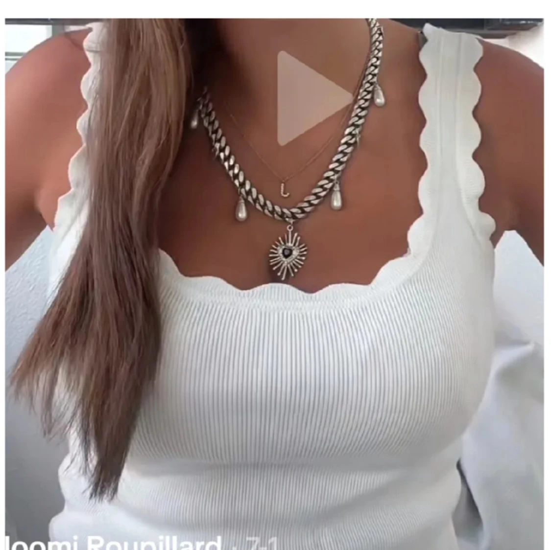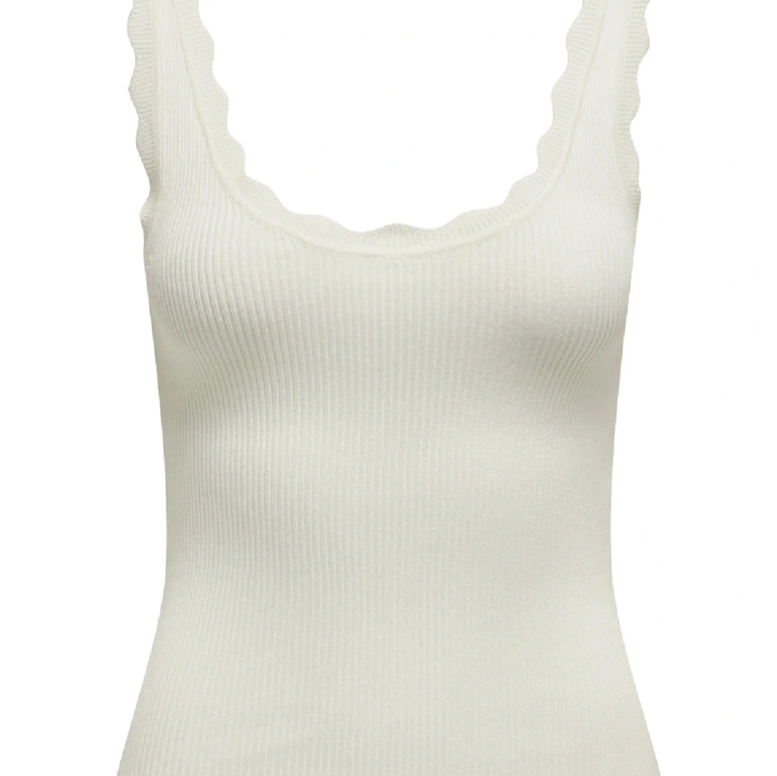 Superfin vit ribbad linnetopp med vågiga kanter längs axelbanden och halsringningen. Toppen är ärmlös och har en tight passform som framhäver figuren. Perfekt att styla med smycken för en trendig look. Prislappen är kvar🎀
