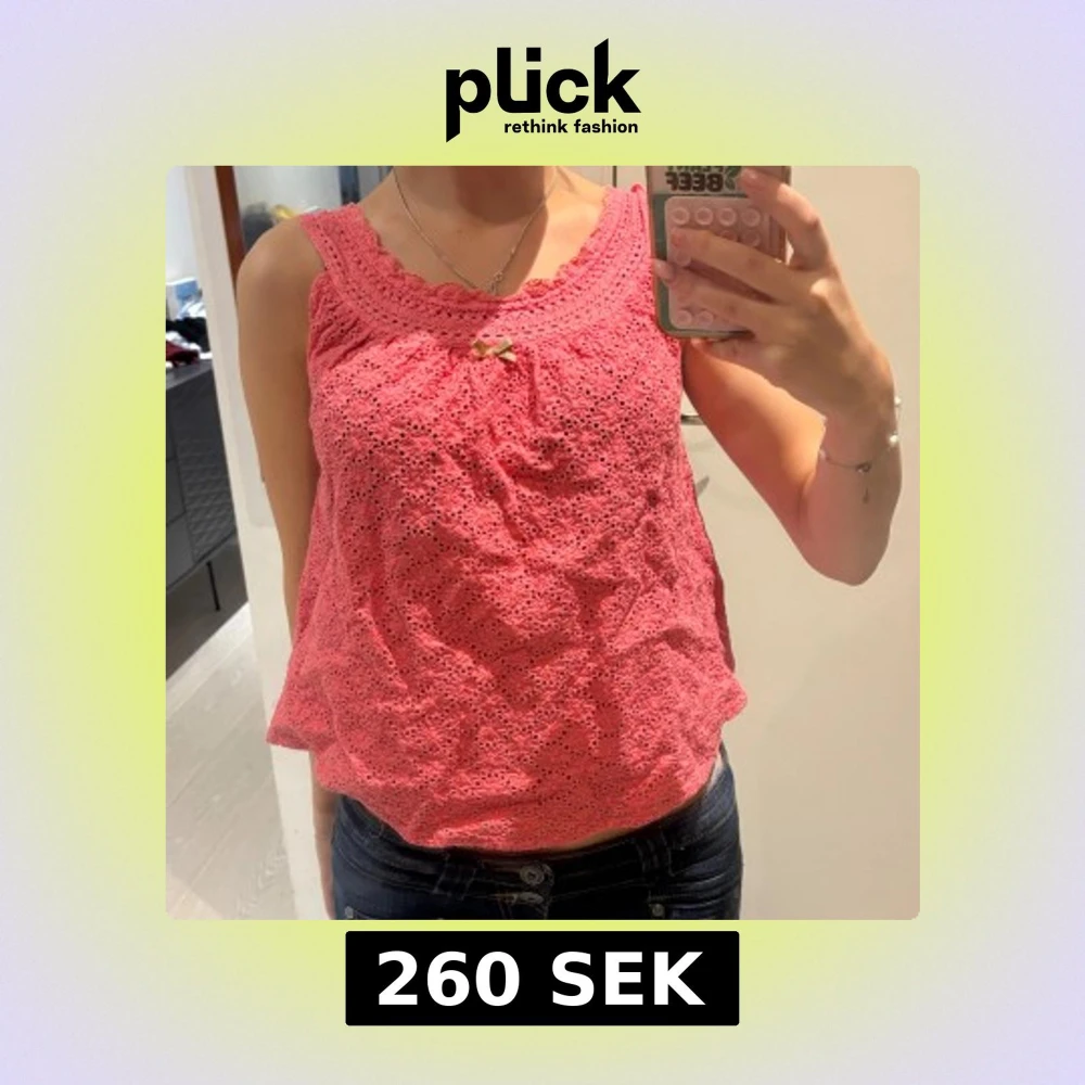 Söt rosa blus från Odd Molly i broderad bomull med blommigt hålmönster, breda axelband och liten beige rosett framtill. På ryggen finns ett färgglatt broderi med texten 'born baby born' och blå detaljer.