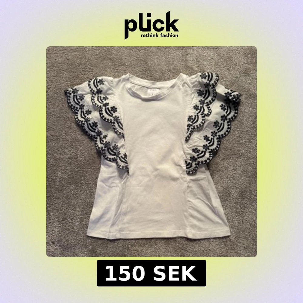 Superfin vit topp från Zara med stora volangärmar som har svart broderat blommönster. Perfekt för dig som vill ha något unikt och snyggt! T-shirten har en klassisk rund halsringning och är i mjuk bomull.