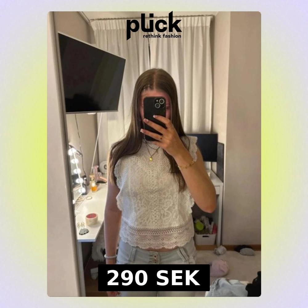 Superfin vit blus i spets med volangdetaljer vid ärmarna och nederkanten. Blusen är ärmlös och har en rund halsringning. Perfekt att styla med jeans eller kjol för en fräsch look.