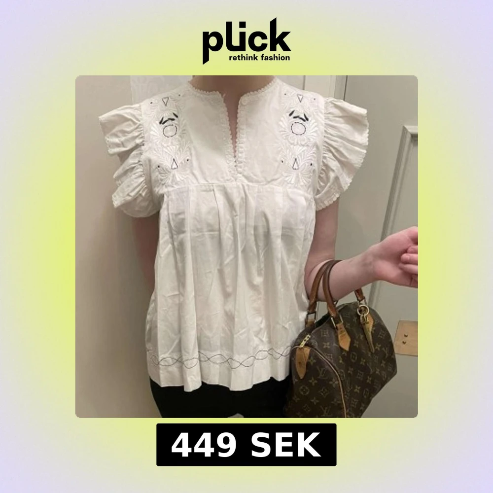 Säljer en söt vit blus från By Malene Birger med broderade detaljer och korta volangärmar. Blusen har en v-ringad hals och fina veck framtill. Perfekt för en stilren look. Sjukt snygg och inga defekter! Sjukt bra kvalitet💕💕 köpt för 1600!