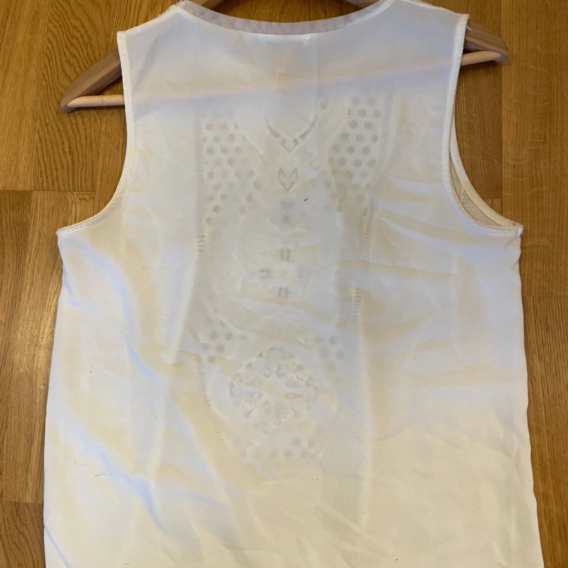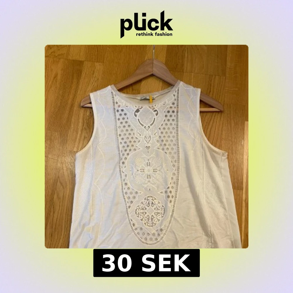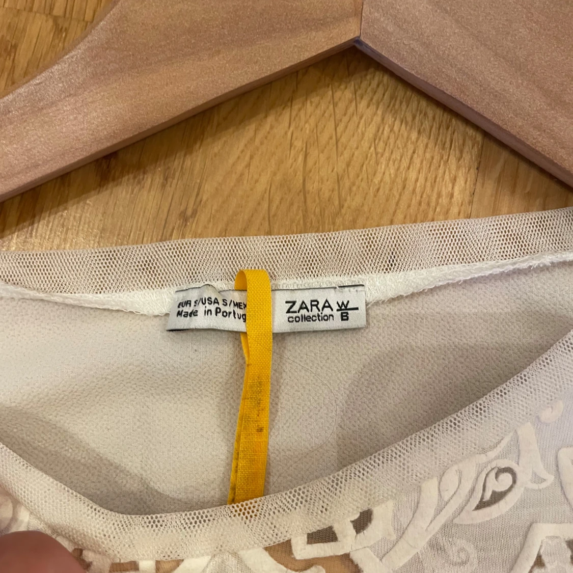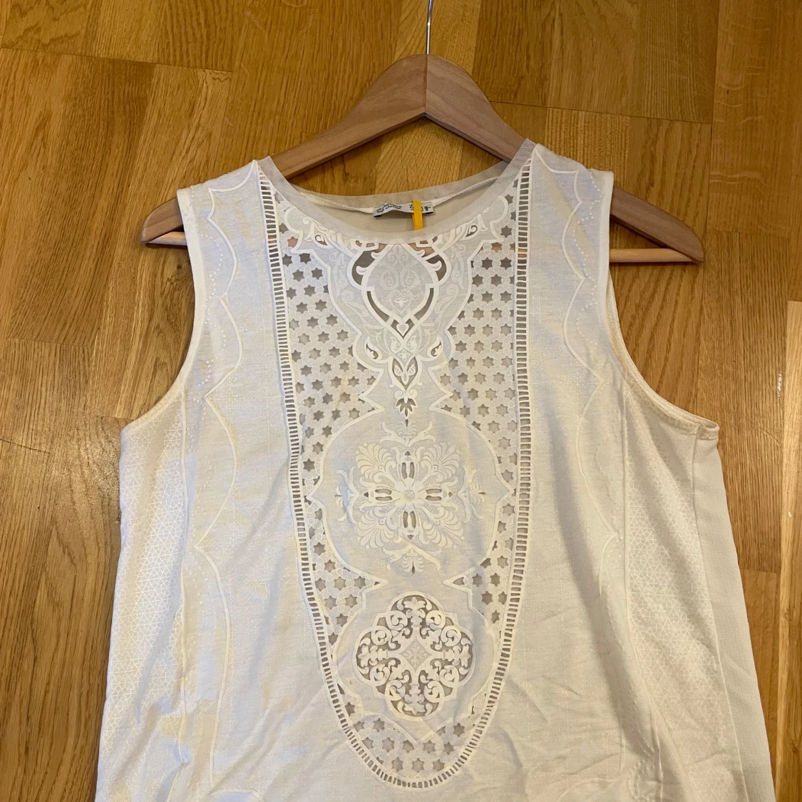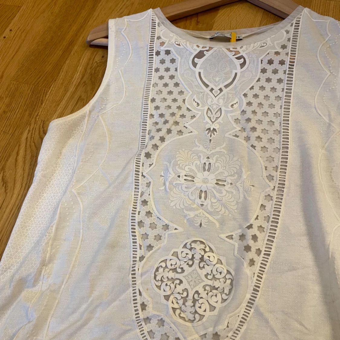 Supersnygg vit ärmlös topp/linne från Zara med detaljerad spets och broderier framtill. Toppen har rund halsringning och ett unikt mönster i spetsen som ger en cool vibe.