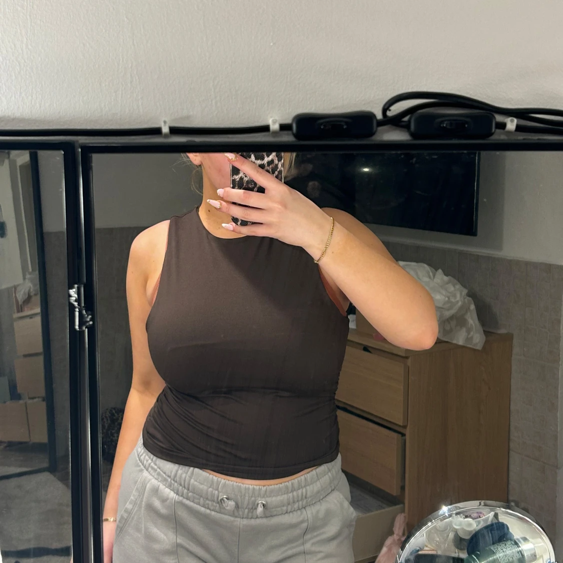 Snygg brun ärmlös linnetopp med rund halsringning. Perfekt att matcha med jeans eller kjol för en stilren look. Mjuk och bekväm passform.