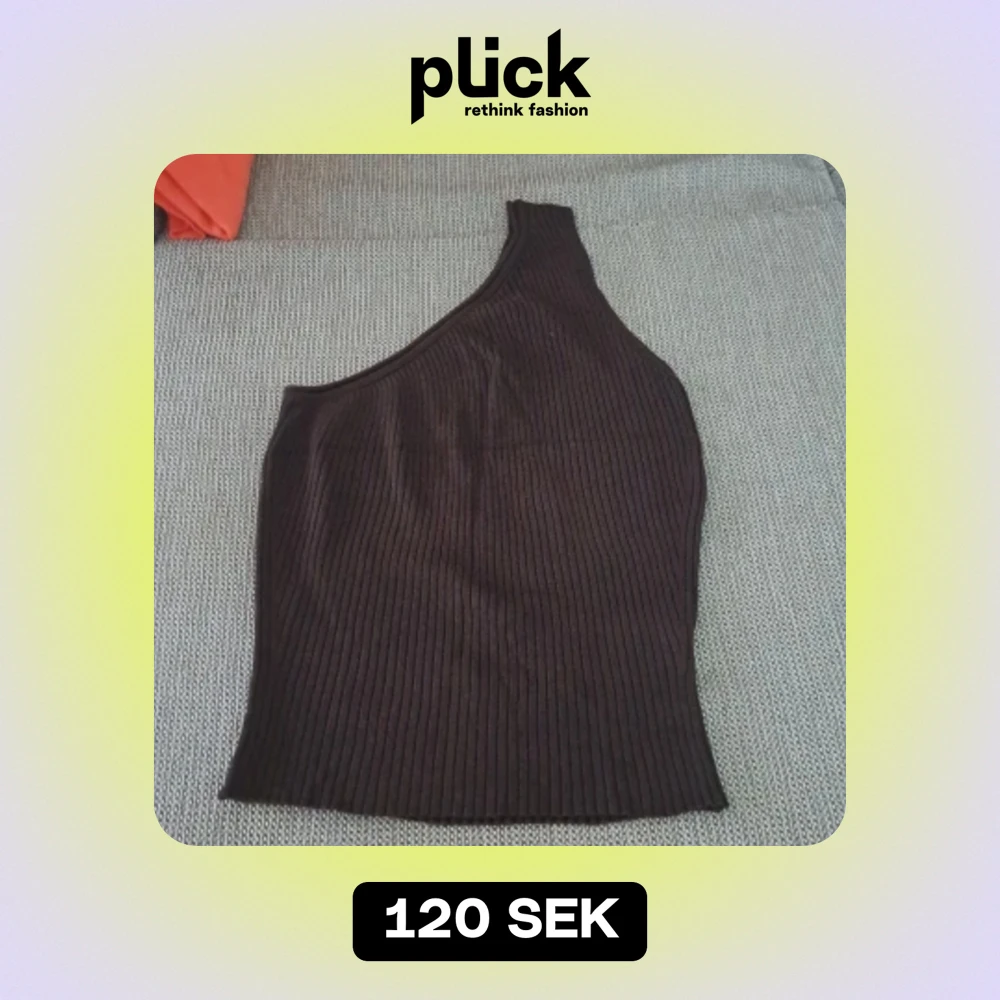 En brun ribbad topp med en axelbandslös design. Toppen har en oneshoulder-stil och är tillverkad av ett stretchigt material som ger en tight passform. 100%. Oanvänd.