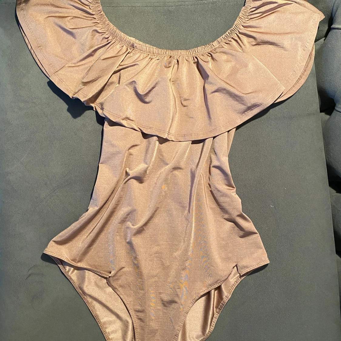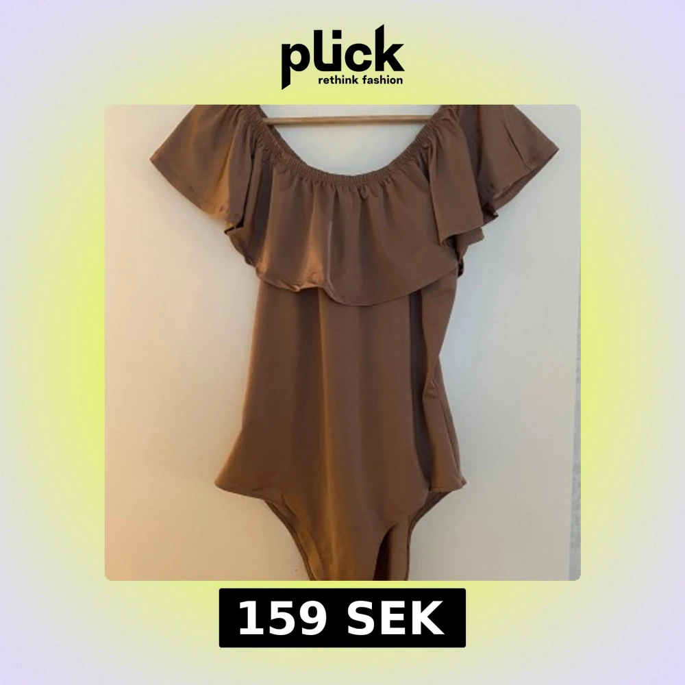 Snygg brun body med off-shoulder design och bred volang runt axlarna. Den är i storlek L men passar även M/S💗