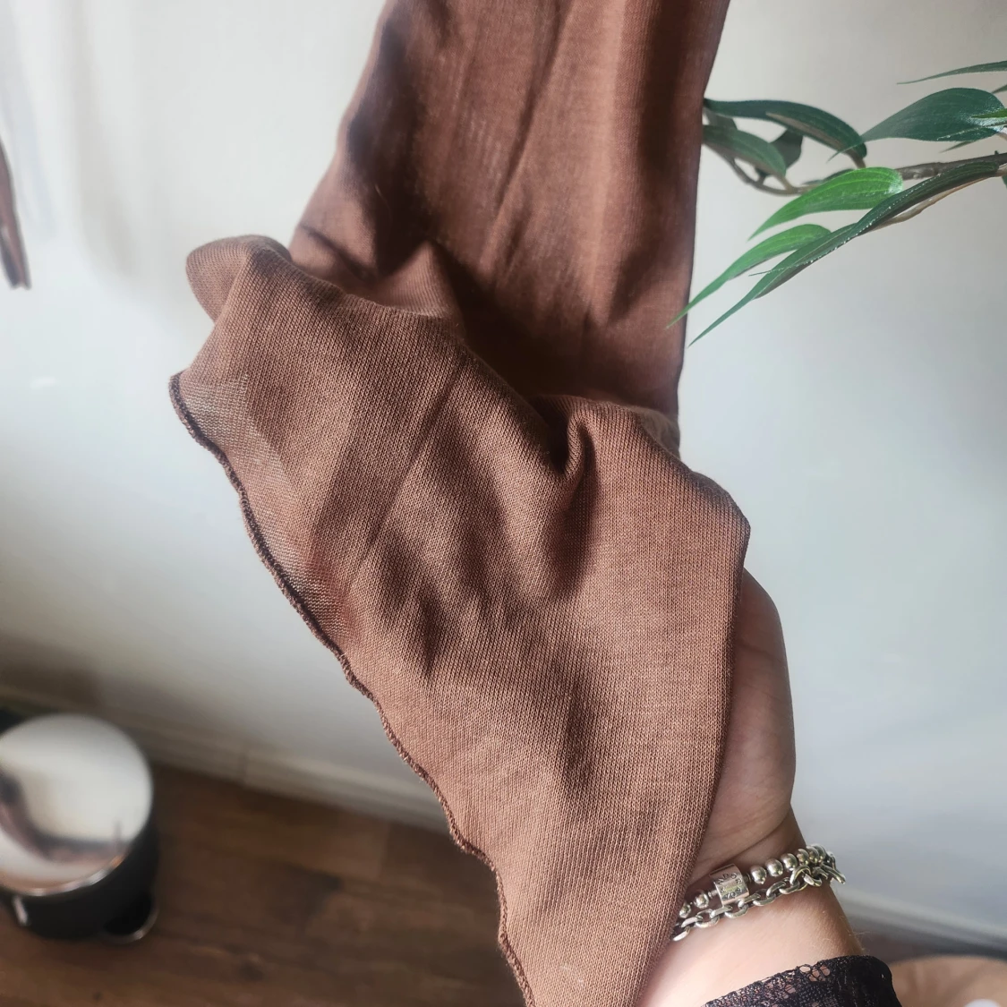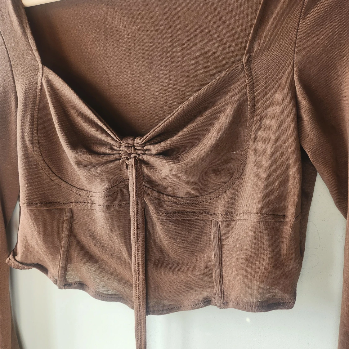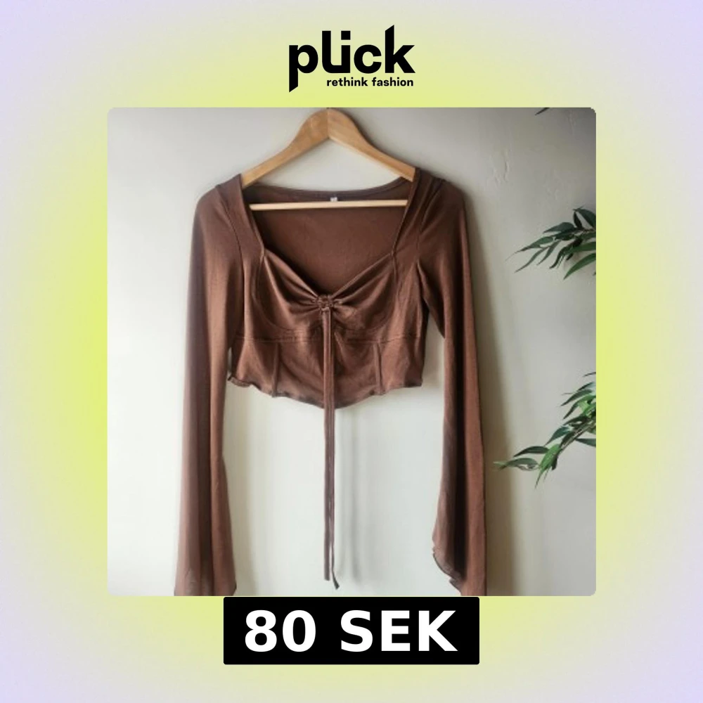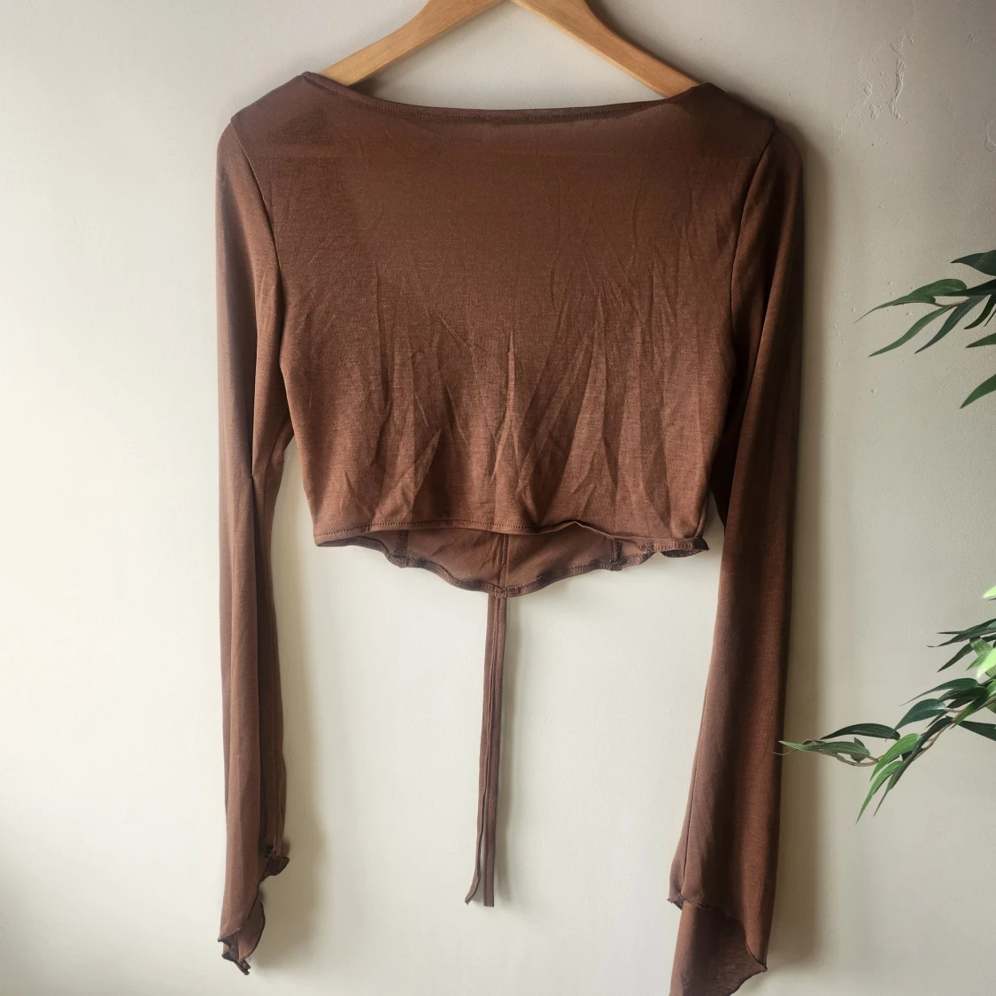 Säljer en brun croppad topp med lång ärm och knytning framtill. Toppen har en v-ringad design och är tillverkad i ett mjukt material. Size L.