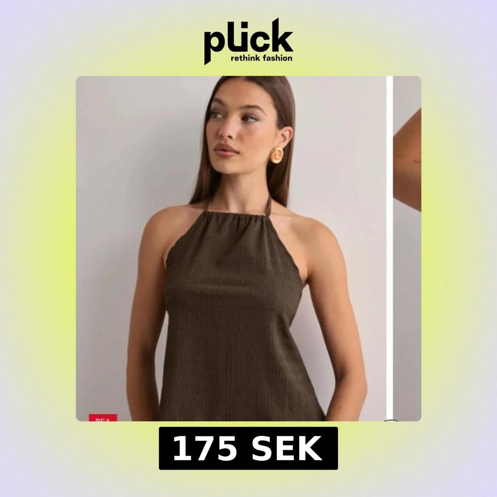 Snygg brun topp med halterneck och öppen rygg. Klänningen har knytband i nacken och baktill, samt en lätt strukturerad yta. Perfekt för varma dagar och ger en trendig look.