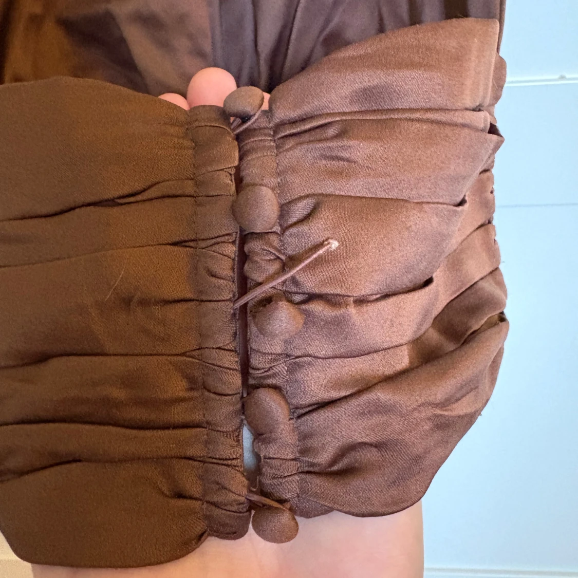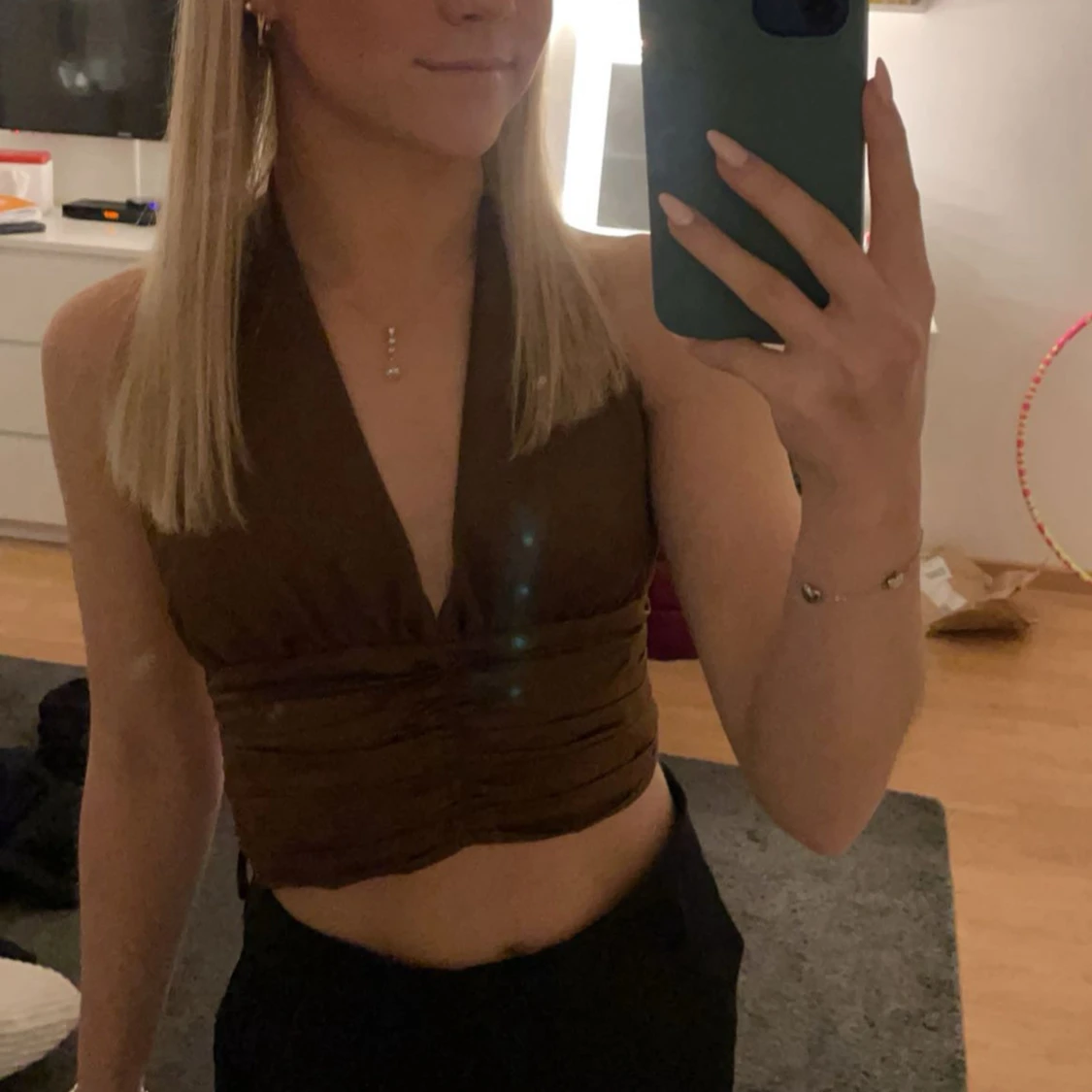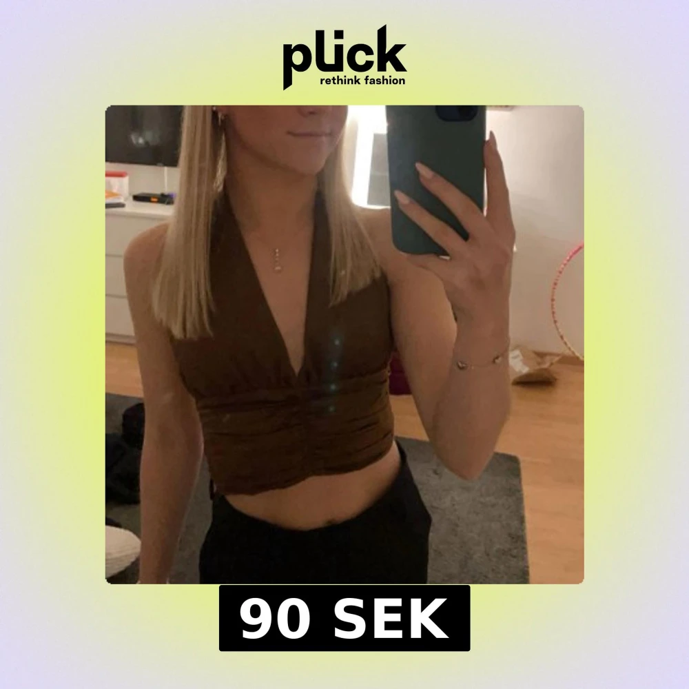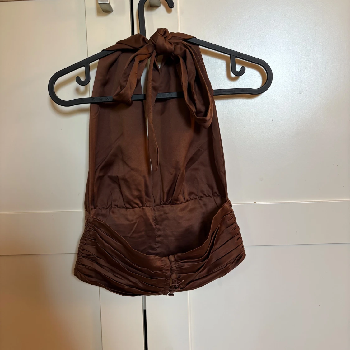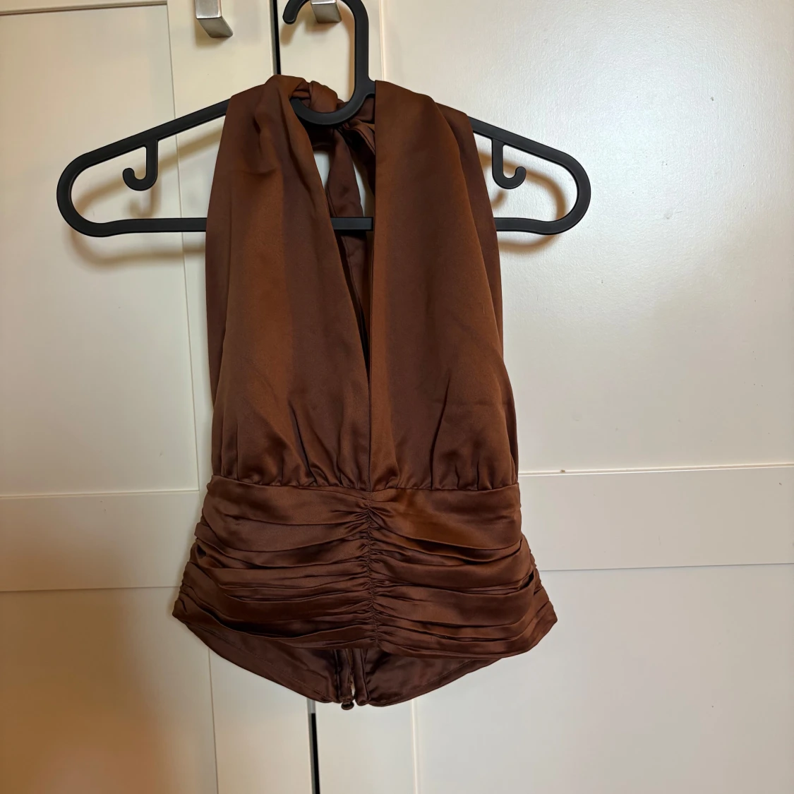 Säljer en snygg brun halterneck topp i glansigt satinliknande material. Toppen har djup v-ringning, knytning i nacken och snygga rynkade detaljer vid midjan. Stängs med klädda knappar baktill för en extra stilren look. Dock är ena tråden till en knapp sönder, men funkar ändå att ha på sig den.