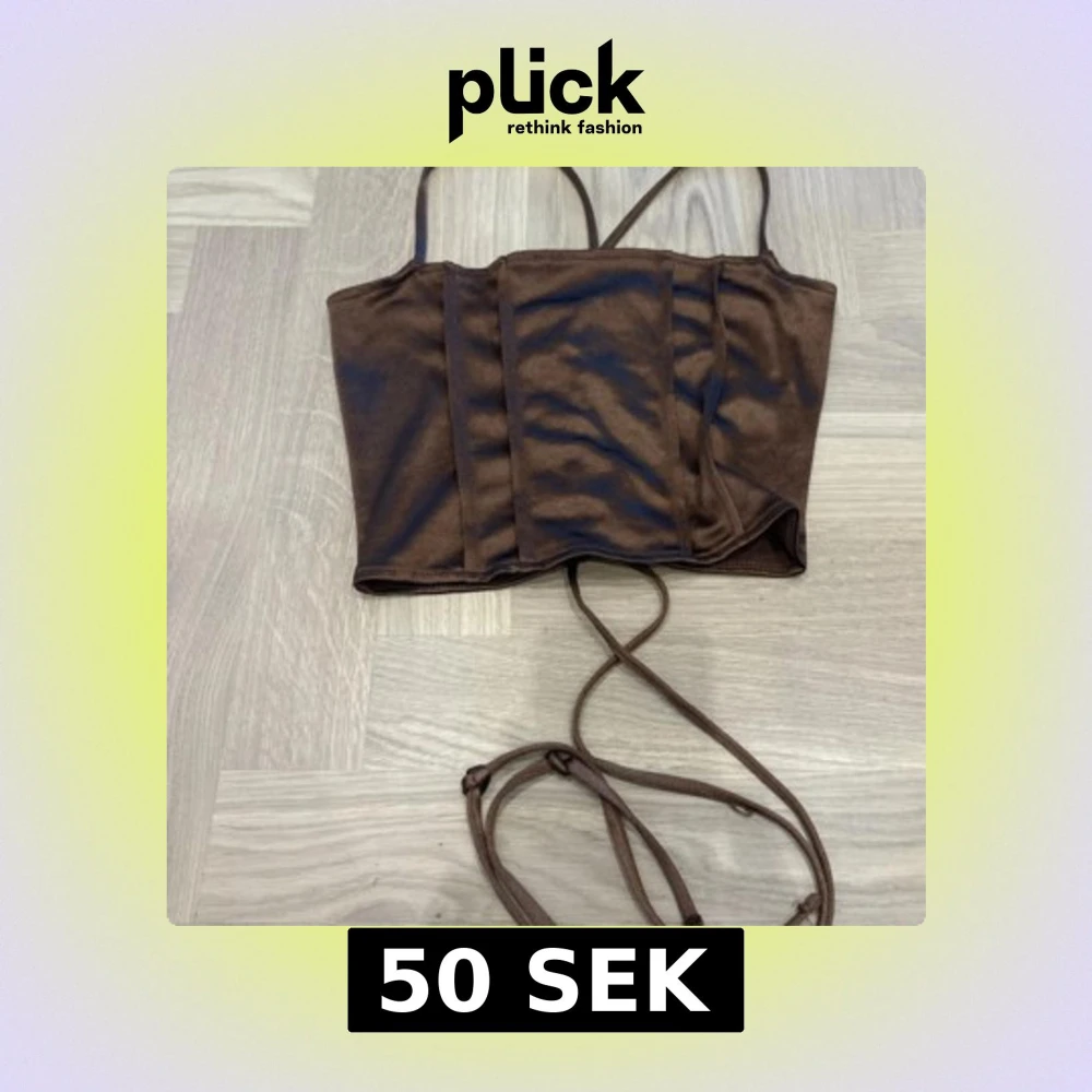 Snygg brun korsett-topp från Boohoo med croppad passform och tunna axelband. Toppen har glansigt material och cool snörning i ryggen som ger en edgy vibe. Perfekt att styla med höga jeans eller kjol för en trendig look.