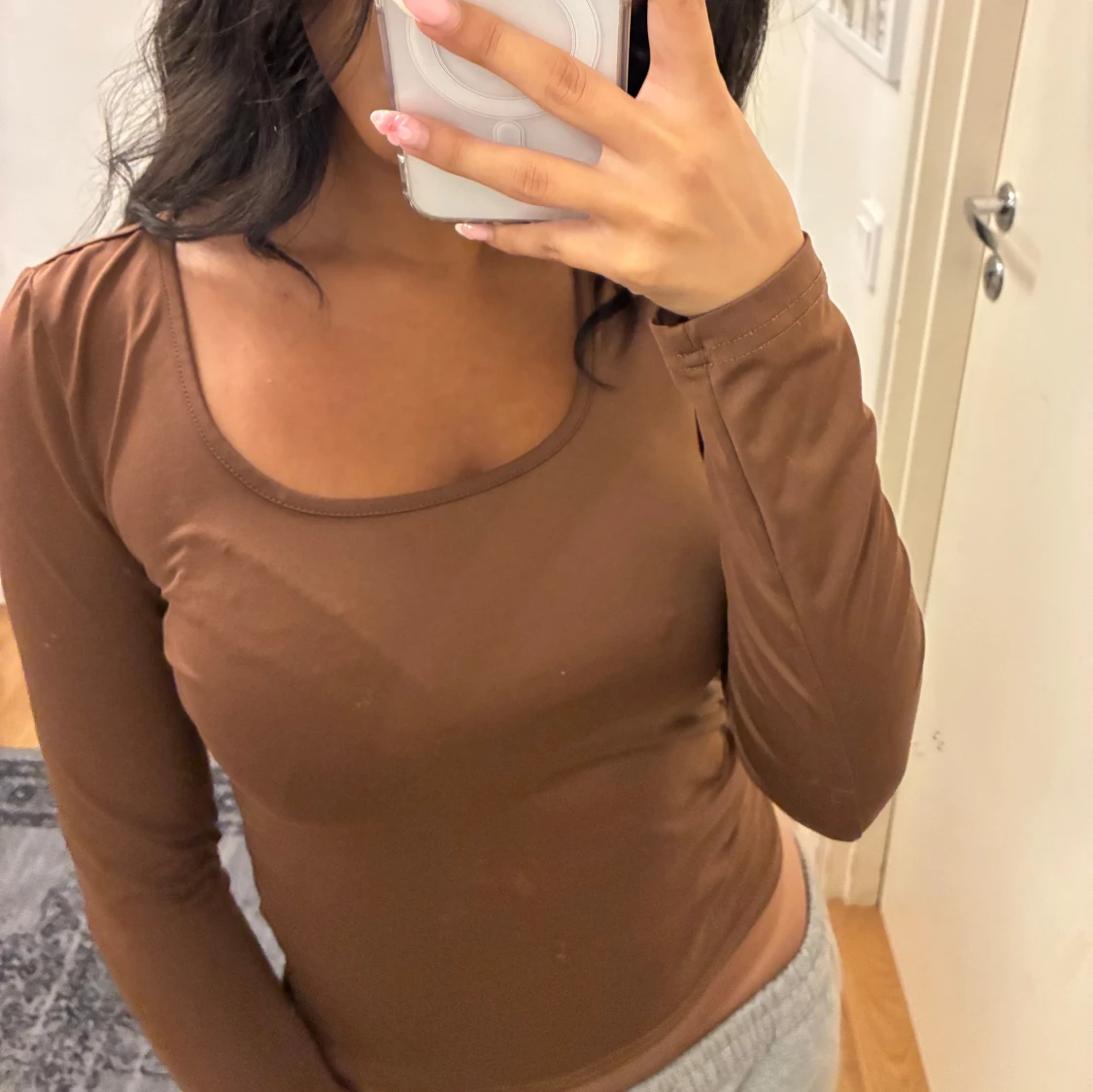 Säljer en brun långärmad topp med rundad, lite djupare halsringning. Modellen är tight och sitter snyggt mot kroppen. Perfekt att styla med jeans eller kjol för en clean look. Materialet känns mjukt och stretchigt.