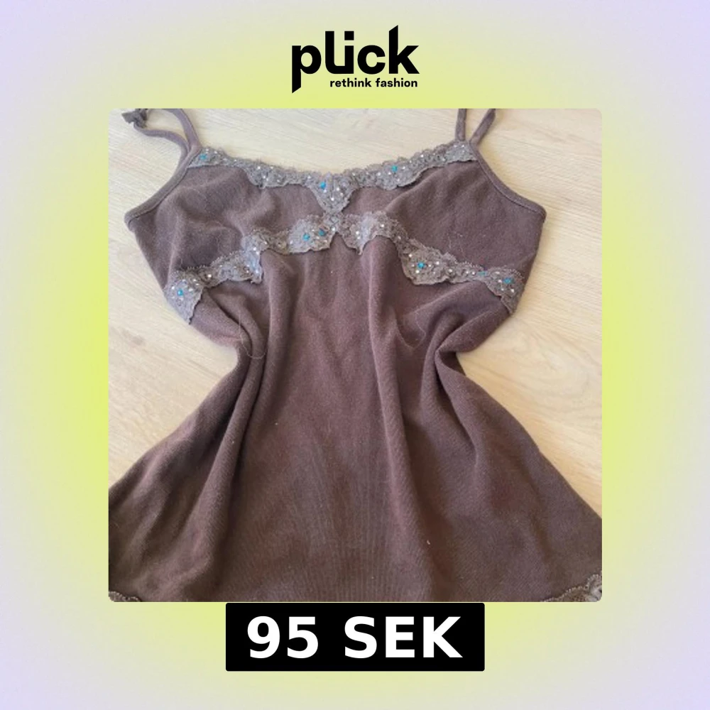 (Pris går att diskuteras❤️) Supersöt brun linnetopp med tunna axelband och dekorativa spetsdetaljer med små pärlor och blå stenar över bysten. Mjuk och stretchig känsla, perfekt för lager-på-lager eller som statement-piece. Snyggt vågig kant nertill.