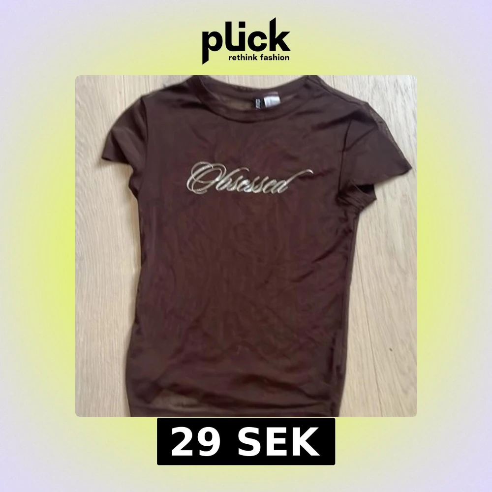 Säljer en brun mesh topp från Divided med glittrig text 'Obsessed' framtill. T-shirten är tight och har korta ärmar. Perfekt att styla lager på lager eller som statement-piece. Passar även S