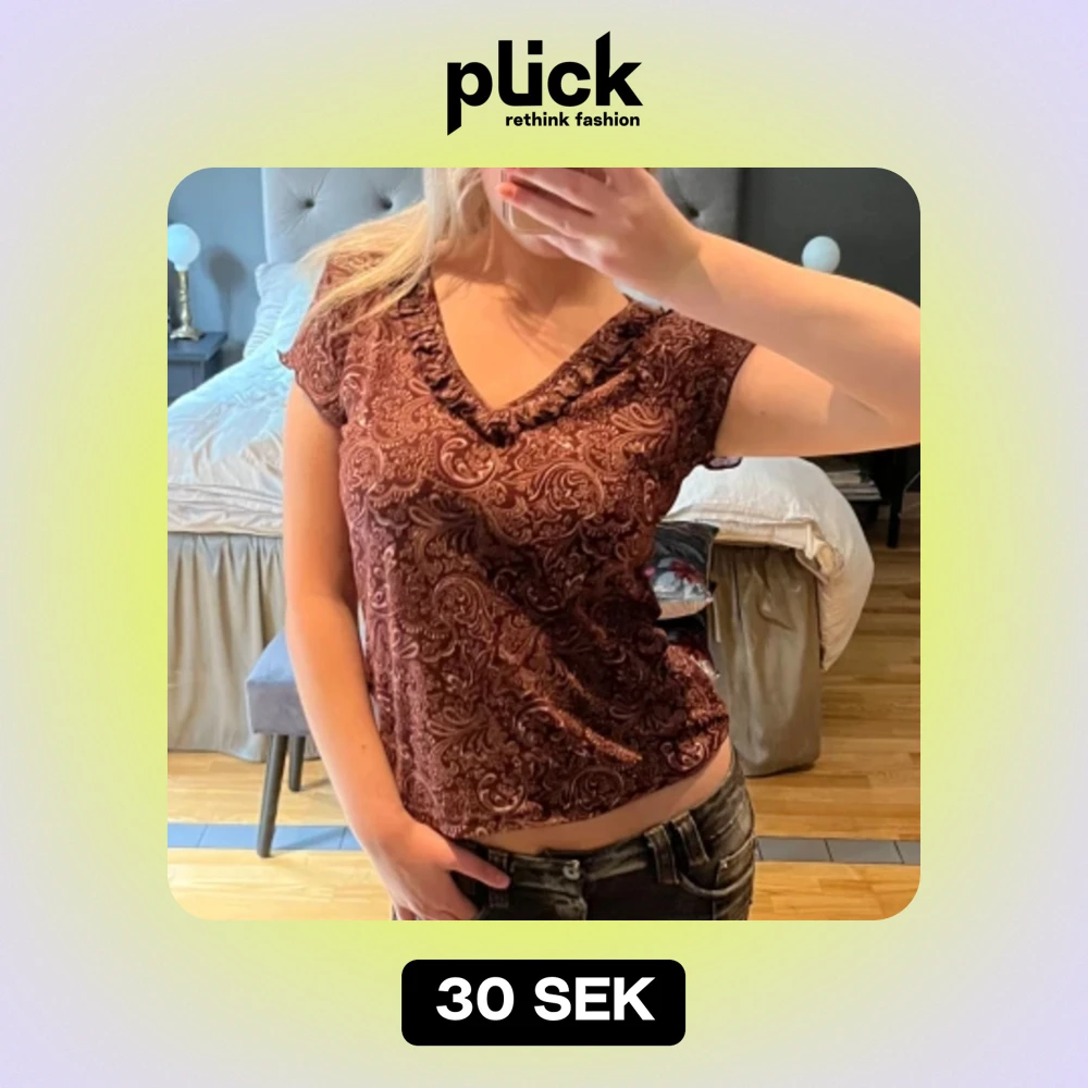 Säljer en superfin vinröd topp med ett snyggt paisleymönster. Den har korta ärmar och en v-ringad hals med volangdetaljer. Perfekt för både vardag och fest! Står tyvärr inte märke eller storlek. Skulle gissa på S eller M.