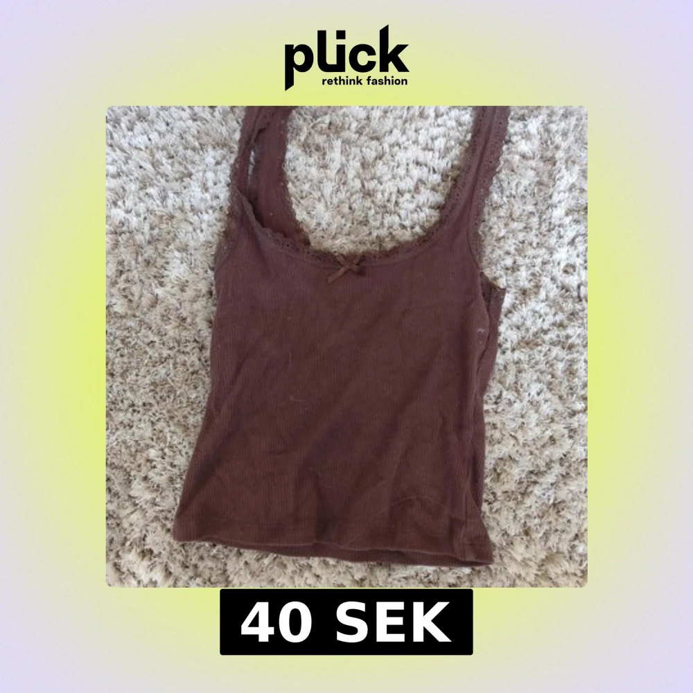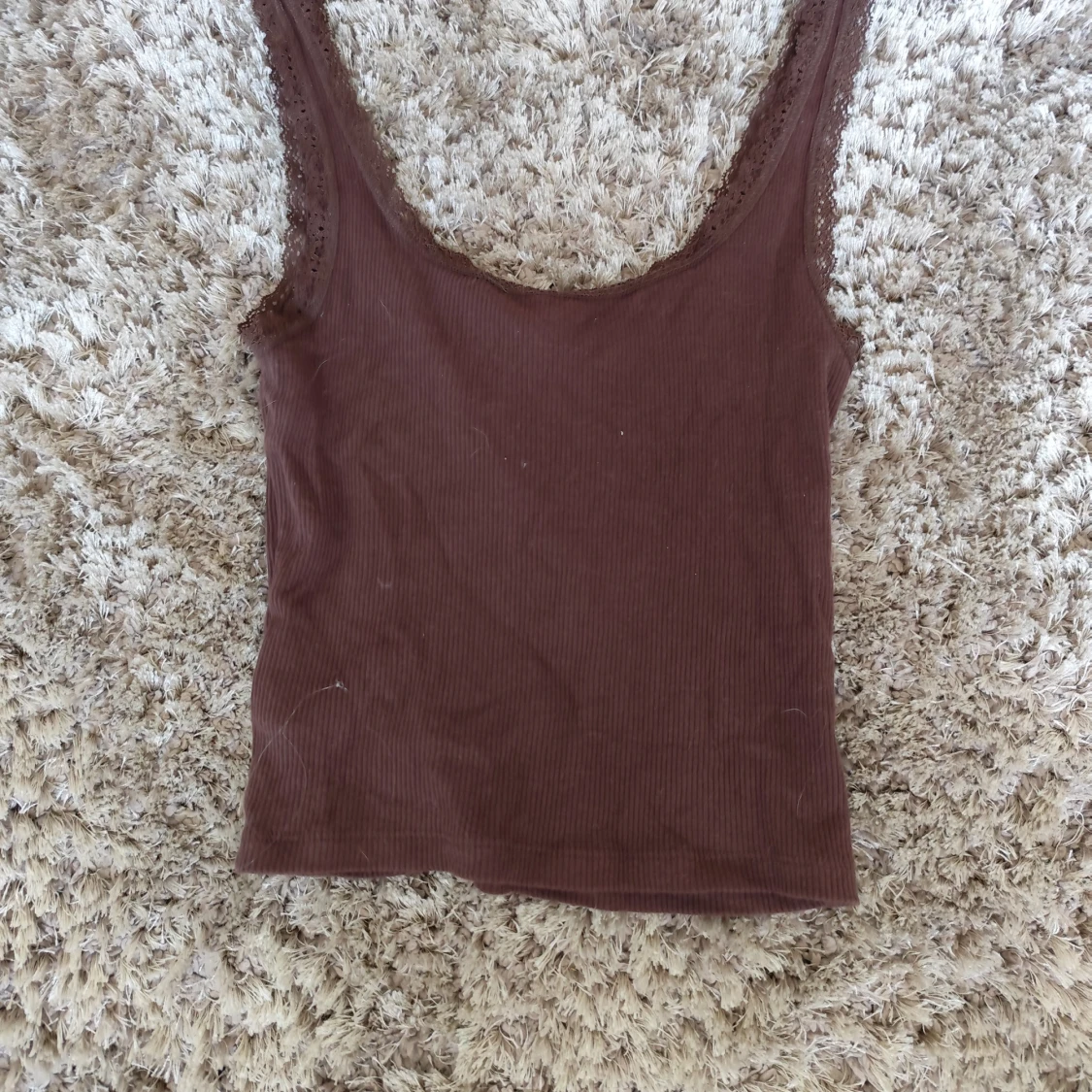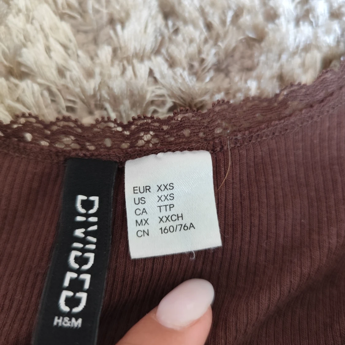 Supersöt brun ribbad linnetopp från H&M Divided i storlek XXS. Toppen har spetskant runt urringningen och en liten rosett framtill. Perfekt för lager-på-lager eller till jeans. Mjuk och stretchig känsla.