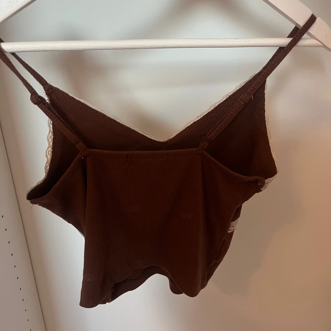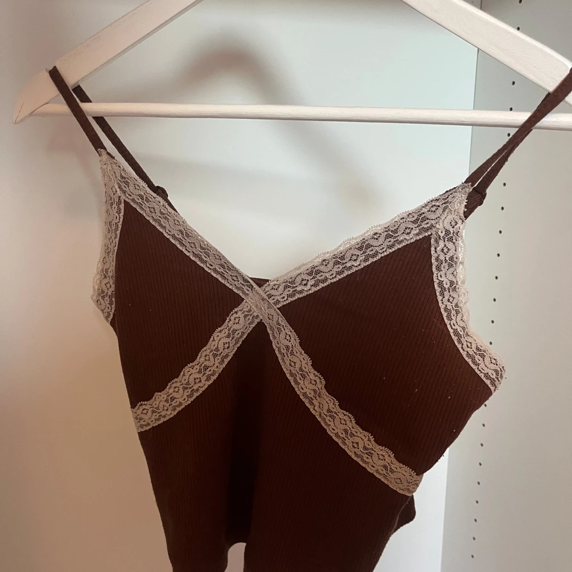 Supersöt brun ribbad linnetopp med tunna axelband och ljus spetsdetalj längs urringningen och framtill.