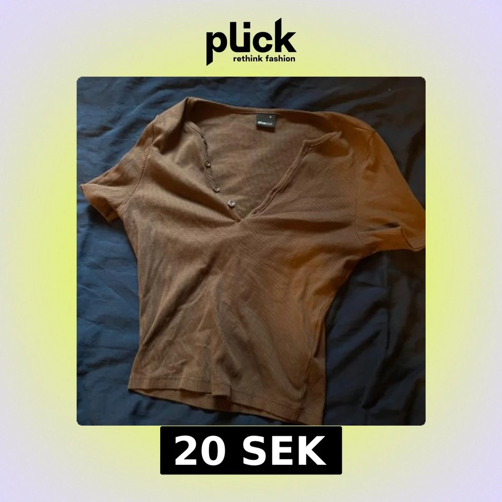 Säljer en brun ribbad topp från Gina Tricot med v-ringning och knappar framtill. Inte använd alls, Toppen har korta ärmar och är perfekt för en avslappnad stil.
