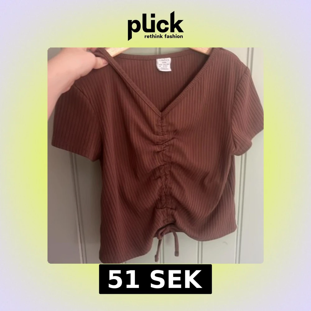 Brun ribbad topp från Lindex med kort ärm och v-ringning. Toppen har snygg snörning framtill som ger en cool rynkad effekt och croppad passform. Perfekt för dig som gillar trendiga detaljer och enkel stil.