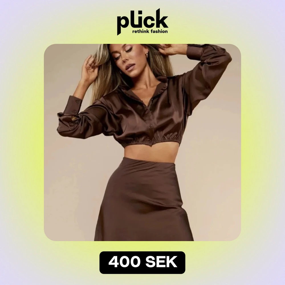 Bianca Ingrosso x Nellys bruna satinblus med en croppad design och långa ärmar. Perfekt för en kväll ute eller en fest. Blusen har en klassisk krage och knappar framtill för en stilren look.