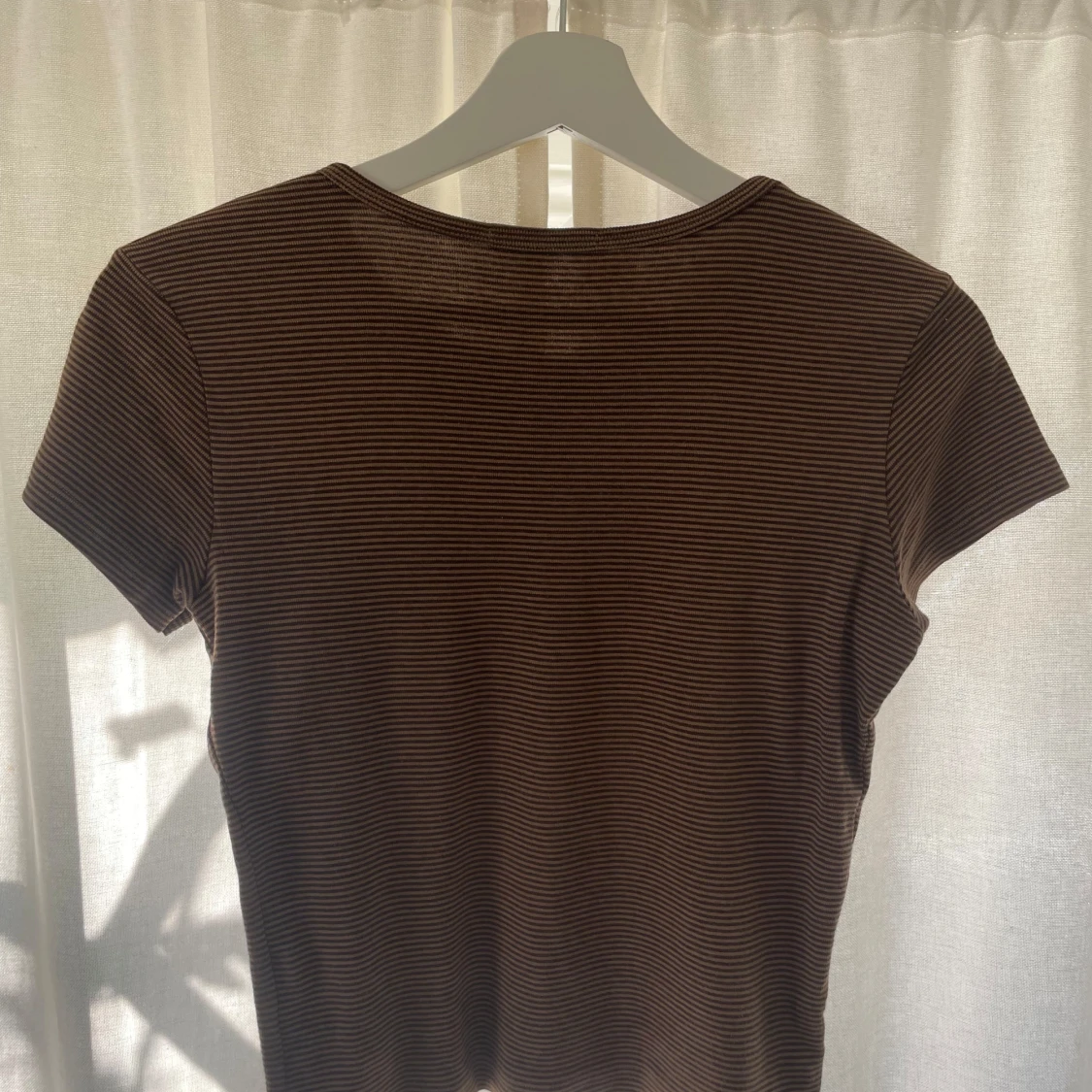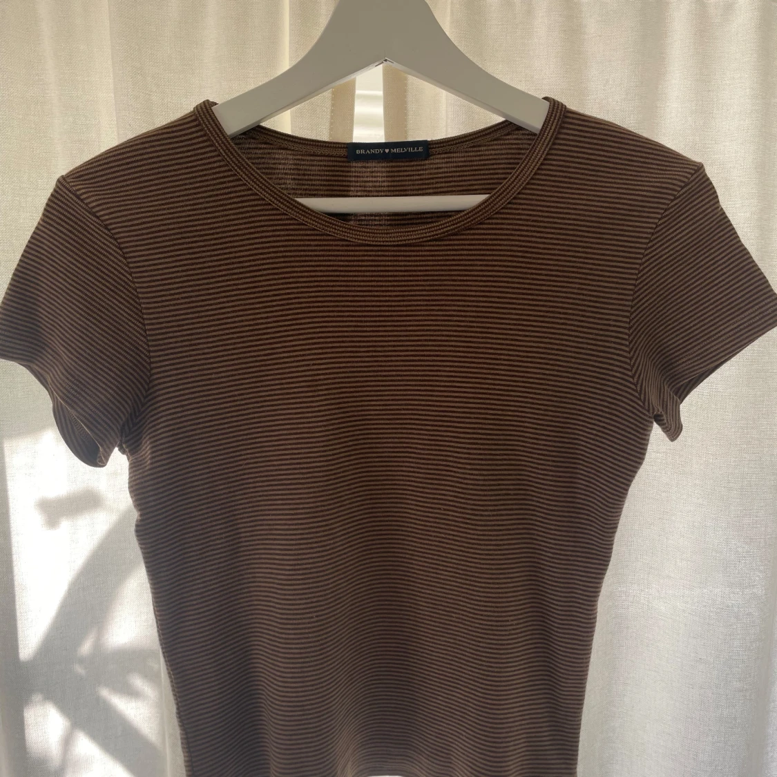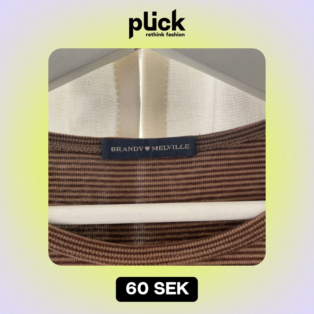 Säljer en superfin brunrandig topp från Brandy Melville. Den är kortärmad och har en normal passform, perfekt för både vardag och fest. Materialet är mjukt och bekvämt, vilket gör den idealisk för alla säsonger. Passar perfekt till jeans eller kjol!