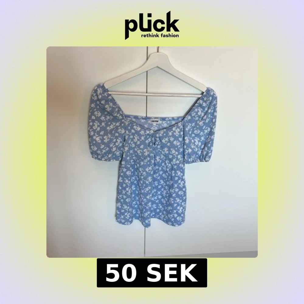 Supersöt blå blus från Bubbleroom i storlek XS med vita blommor, puffiga korta ärmar och smockad struktur. Aldrig använd, som ny.