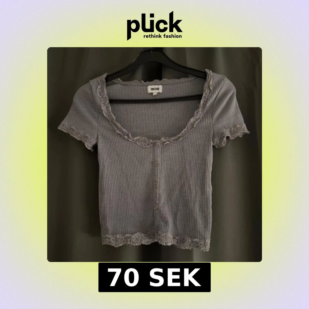 Supersöt grå ribbad topp från bubbleroom med korta ärmar, knappar framtill och fina spetsdetaljer vid halsringning, ärmslut och nederkant.