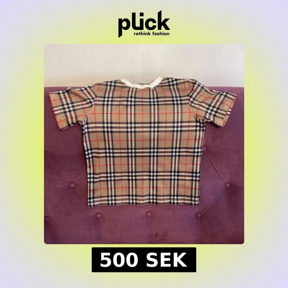 Säljer en snygg rutig topp från Burberry i beige, svart och röd. Toppen har korta ärmar och en klassisk rund halsringning. Perfekt för en stilren look. Orginal pris. 2000kr