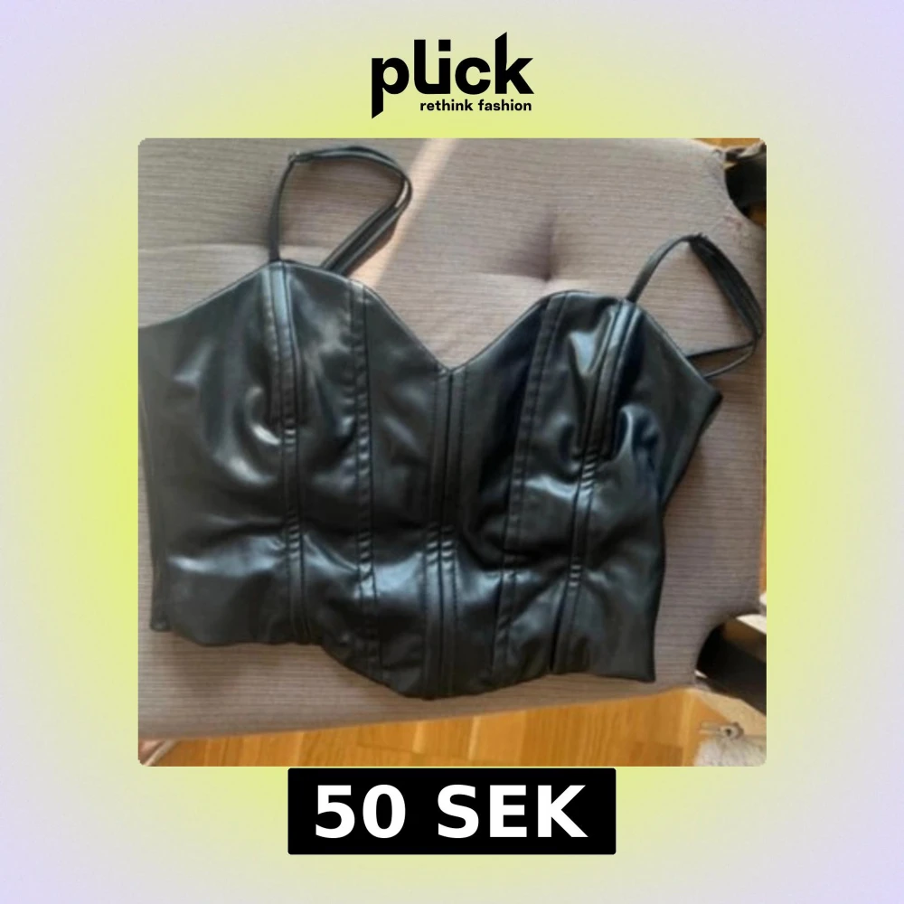 Snygg svart korsett-topp med justerbara smala axelband och markerade sömmar framtill. Topen är croppad och har dragkedja i sidan för enkel på- och avtagning. Materialet är skinnimitation som ger en cool och edgy vibe.