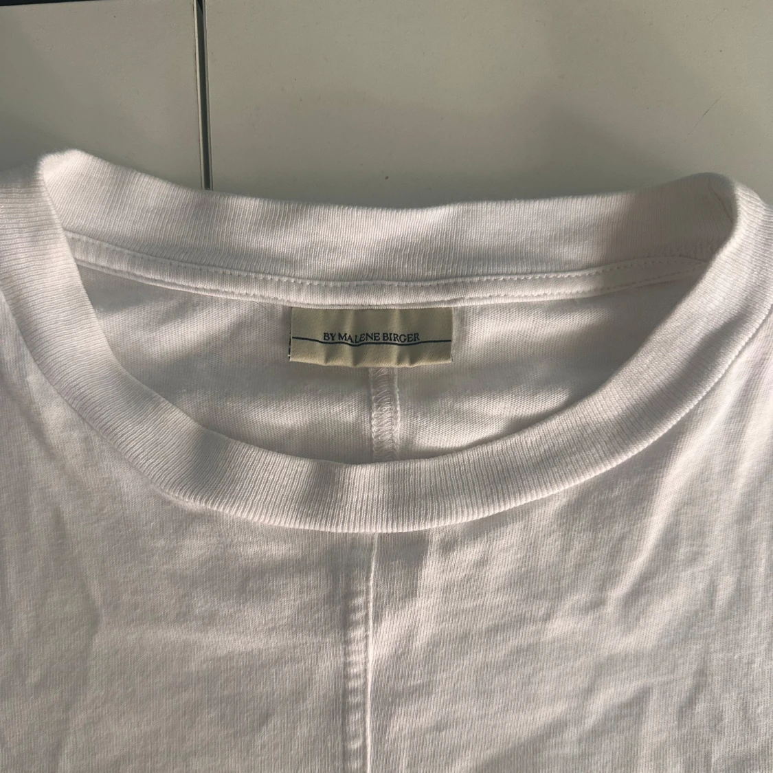 Säljer en stilren vit T-shirt från By Malene Birger. Tröjan har korta ärmar och en lös passform med fina veckdetaljer framtill. Perfekt för en chic och avslappnad look. Ny pris 1050