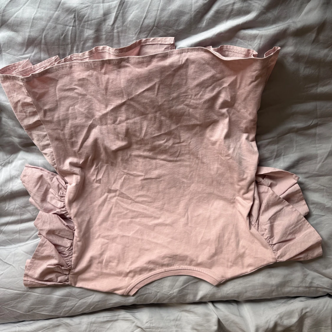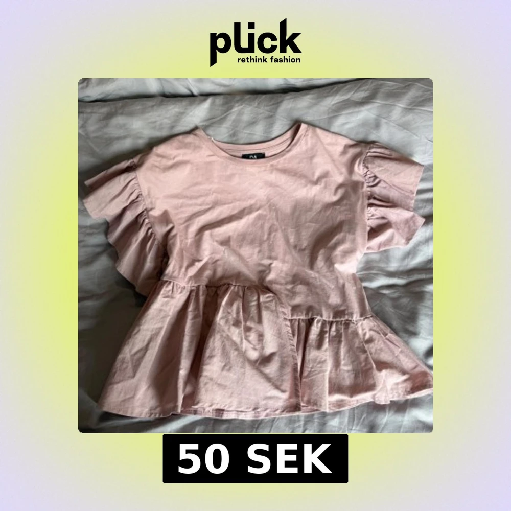Supersöt ljusrosa blus från C&A i mjuk bomull. Blusen har volanger både på ärmarna och nedtill, vilket ger en extra feminin och lekfull vibe. Rund halsringning och korta ärmar med volangdetaljer gör den perfekt för vår och sommar.