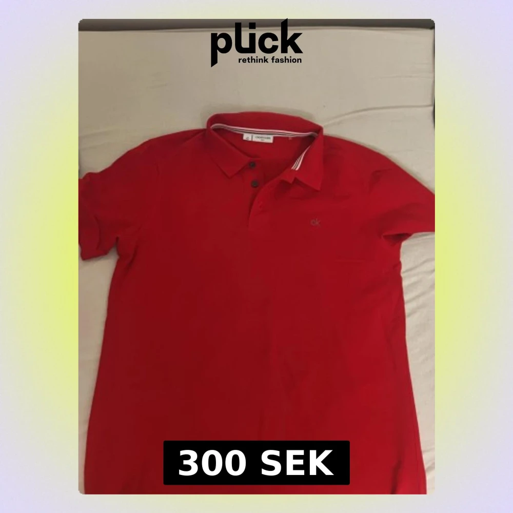 Säljer en klassisk röd pikétröja från Calvin Klein med liten ck-logga på bröstet. Tröjan har krage, två knappar och korta ärmar. Perfekt till jeans eller shorts för en clean och stilren look.