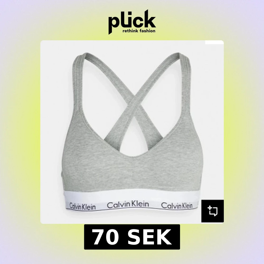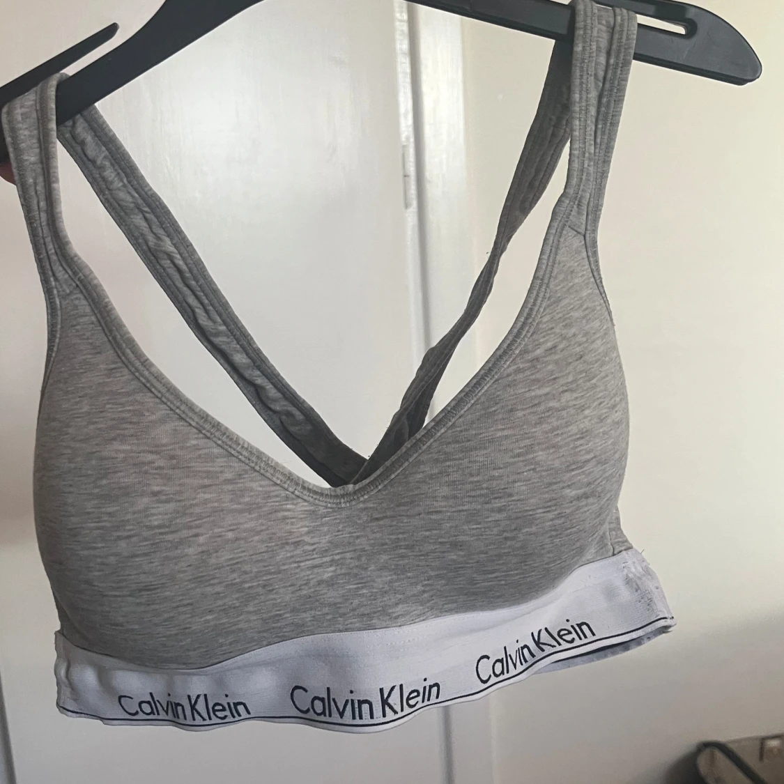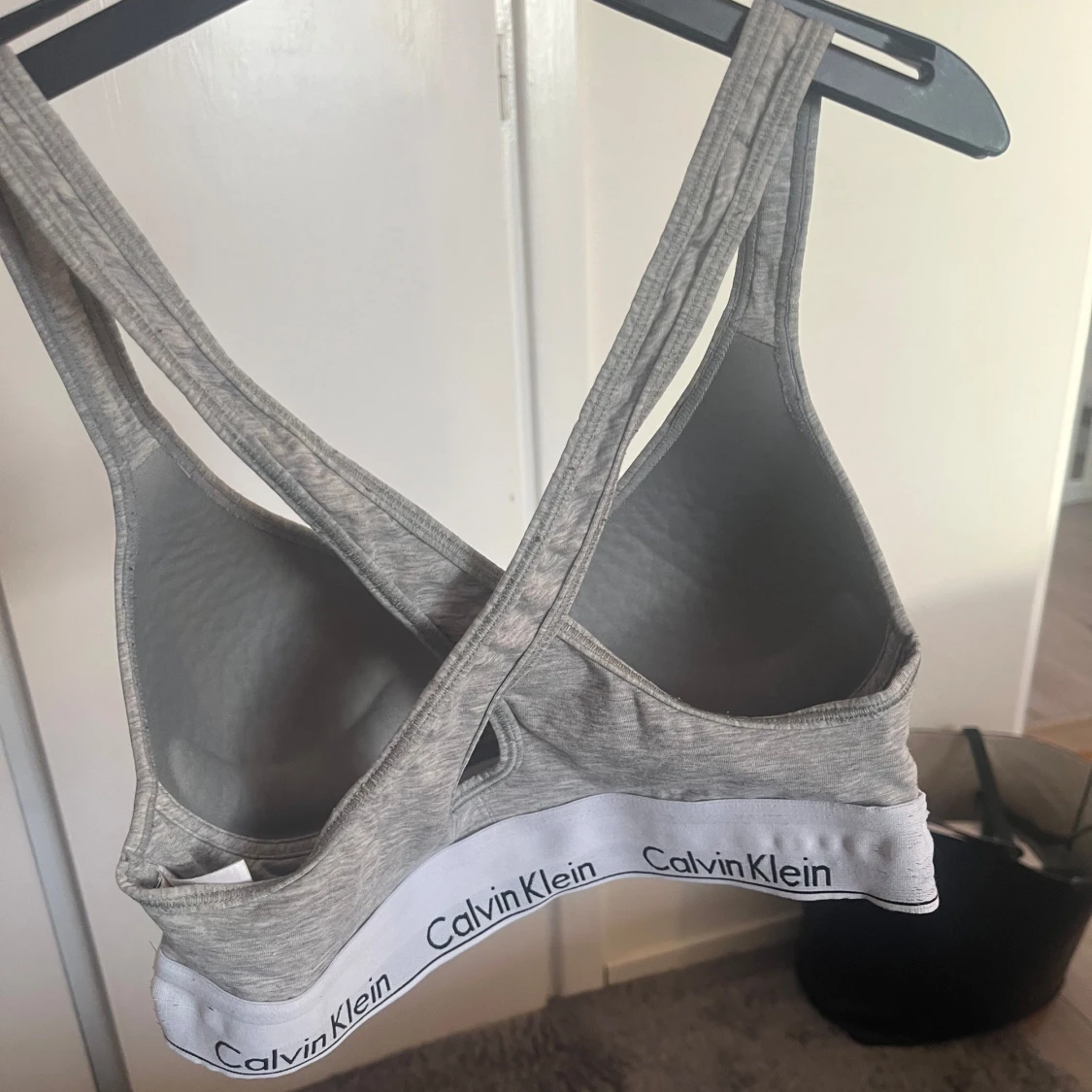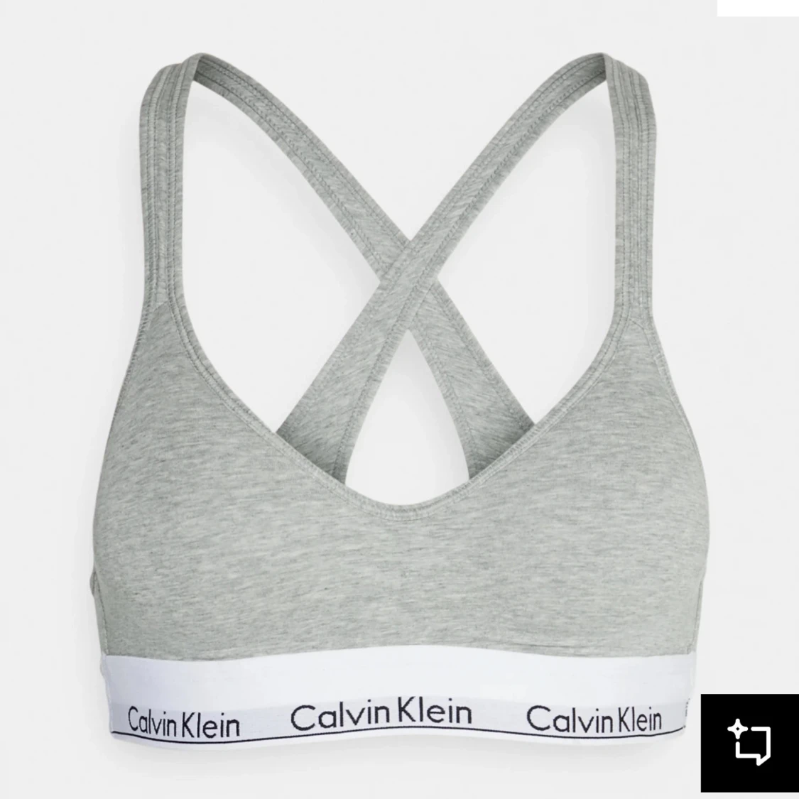 Sport-bh i ljusgrå bomull med bred resår och Calvin Klein-logga i vitt och svart. Korsade axelband i ryggen för extra stöd och snygg look. Perfekt för träning eller chill dagar.