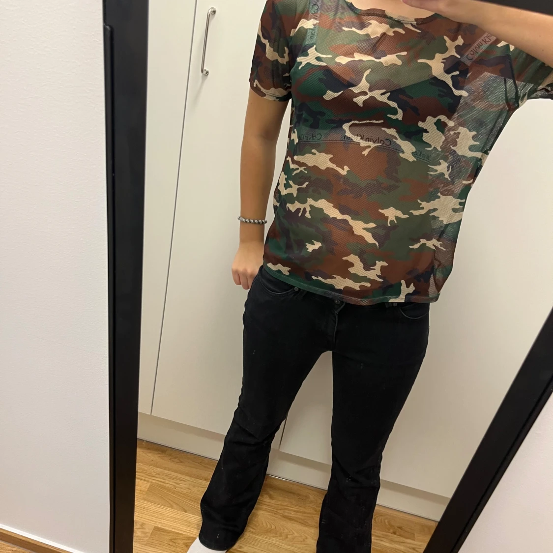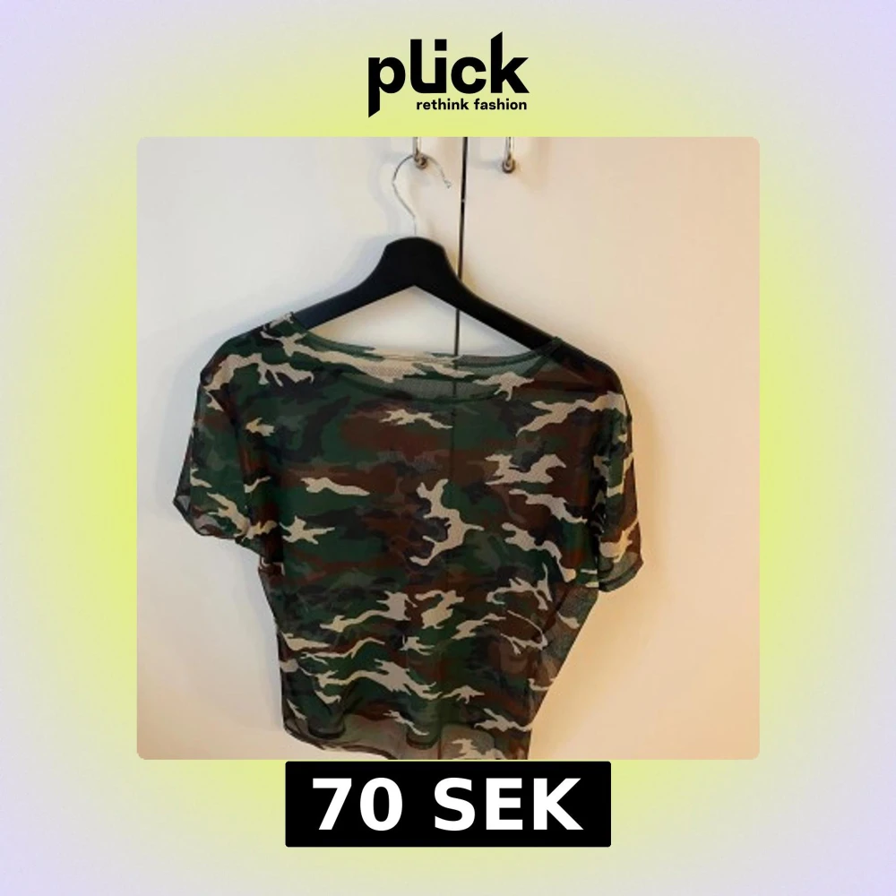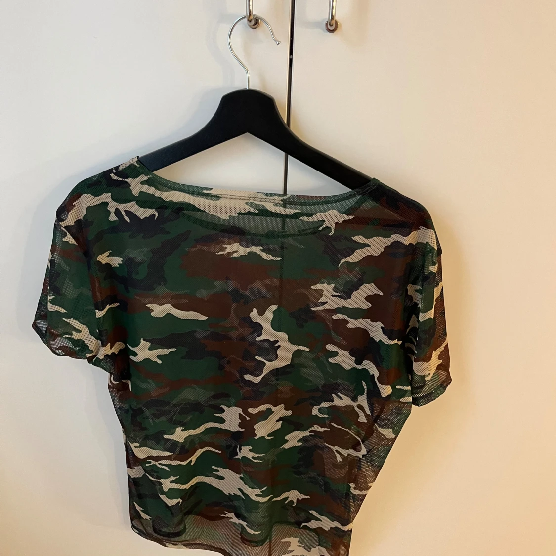 Säljer en transparent mesh topp från Midnight Fashion med camouflage-mönster i grönt, brunt och beige. T-shirten har korta ärmar och en loose fit, perfekt för att skapa en edgy look. Superlätt och luftig, snygg att styla lager på lager.