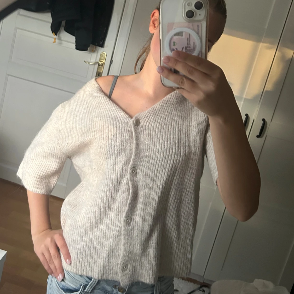 Supermysig beige stickad blus med ribbat material och knappar framtill. Modellen är croppad med v-ringning och trekvartsärm, perfekt för lager-på-lager och chill vibes. Snygg att bära off-shoulder för en avslappnad look.