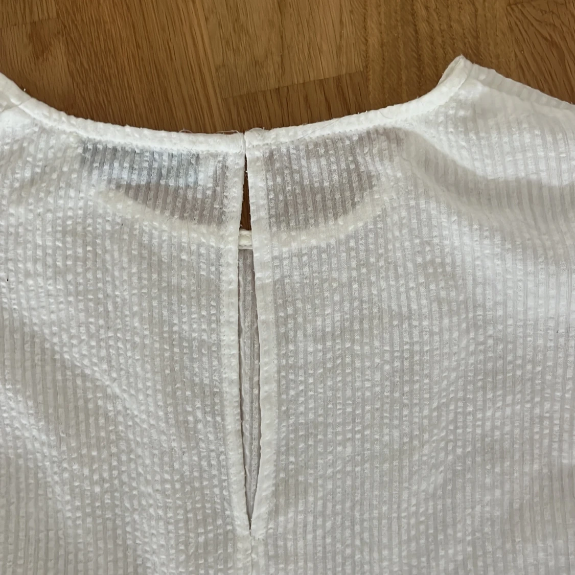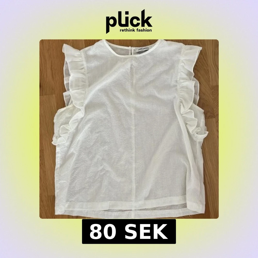 Supersöt vit blus från Carin Wester med diskret randig struktur och volangdetaljer längs ärmhålen. Blusen är ärmlös och har en liten knapp i nacken. Perfekt för dig som gillar en romantisk och stilren look.🌸