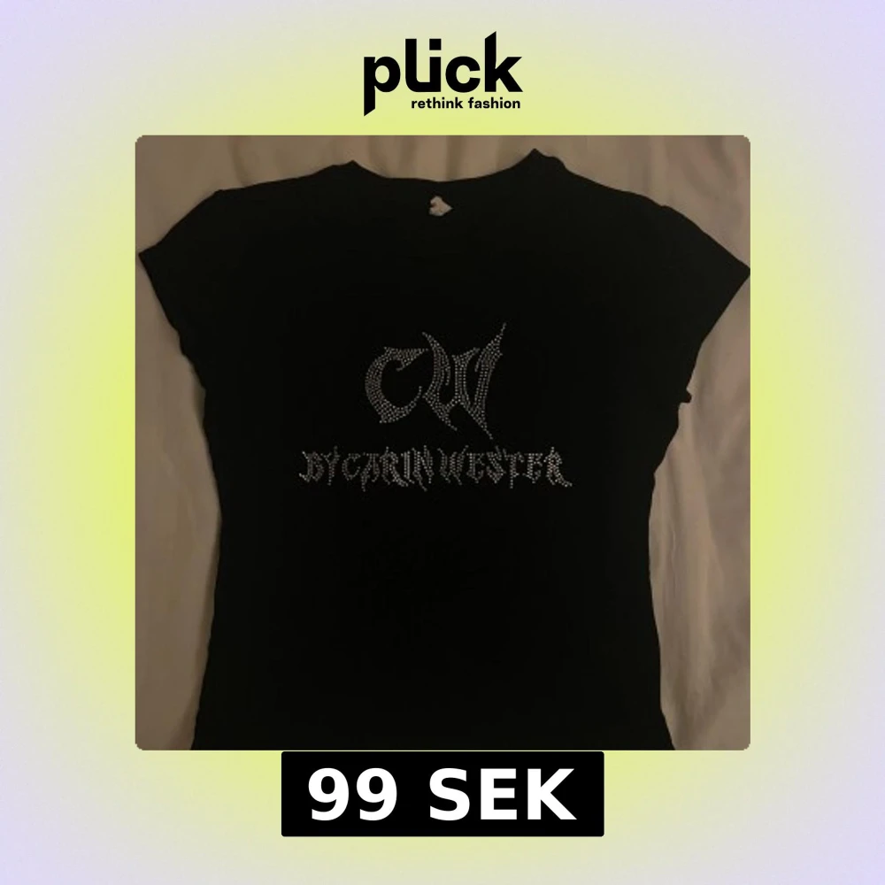 Säljer en svart kortärmad topp från Carin Wester med coolt CW-tryck och text i strass framtill. T-shirten har en klassisk rund halsringning och är gjord i mjukt material. Perfekt för dig som gillar statement-plagg med lite edge.