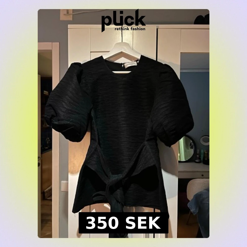 Säljer en svart blus från Carin Wester med stora puffärmar och snygg knytning i midjan. Blusen har en strukturerad yta. Perfekt för dig som vill ha en statement topp med cool siluett. Använd en gång endast!