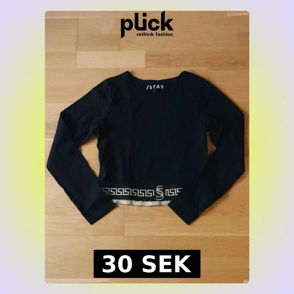 Svart långärmad crop top med rund hals och snyggt guldfärgat mönster längs nederkanten. Stilren men ändå med det där lilla extra.