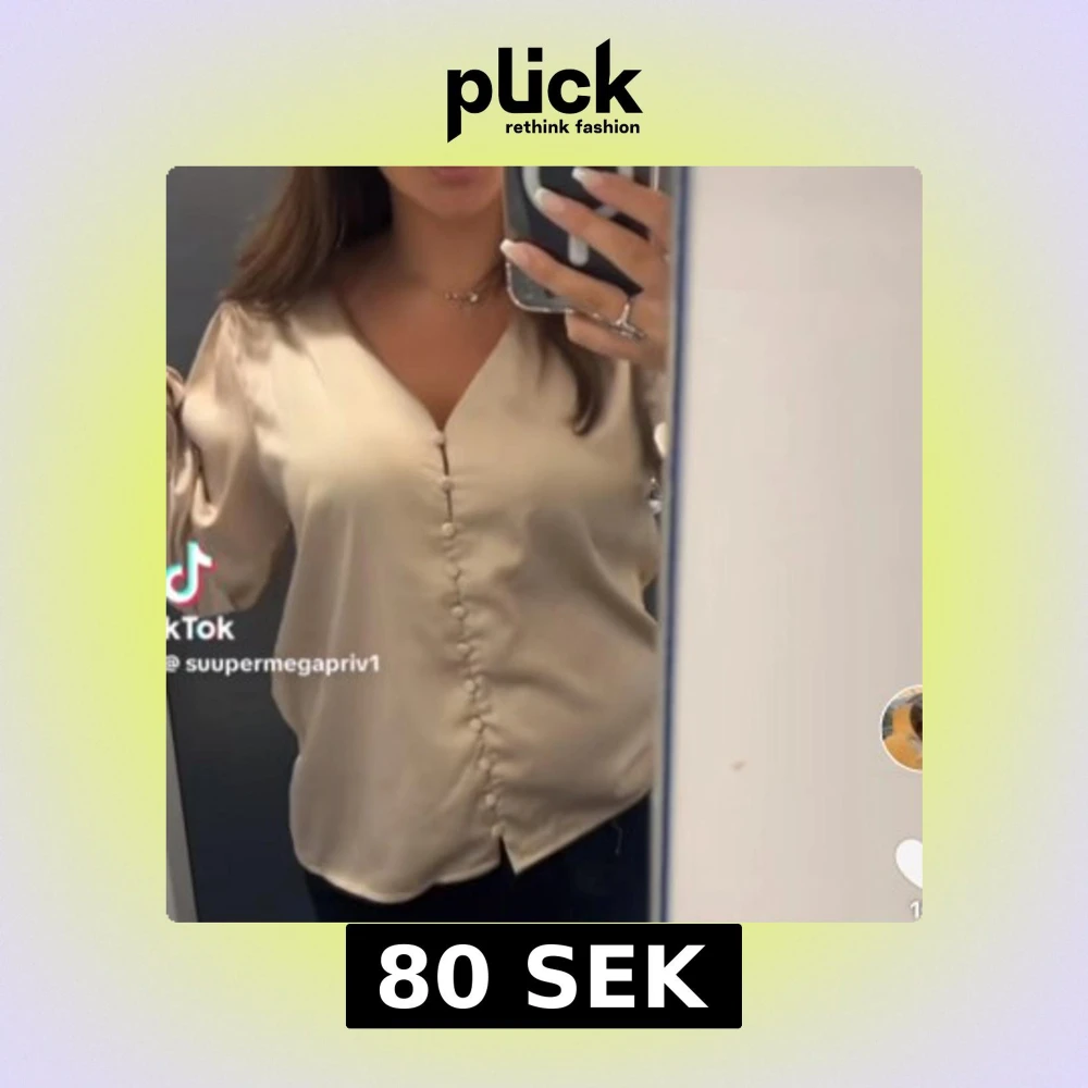 Säljer en champagnefärgad blus med v-ringning och dekorativa knappar framtill. Blusen har långa ärmar och ett mjukt, glansigt material som ger en lyxig känsla. Perfekt för dig som gillar stilrena och eleganta plagg.