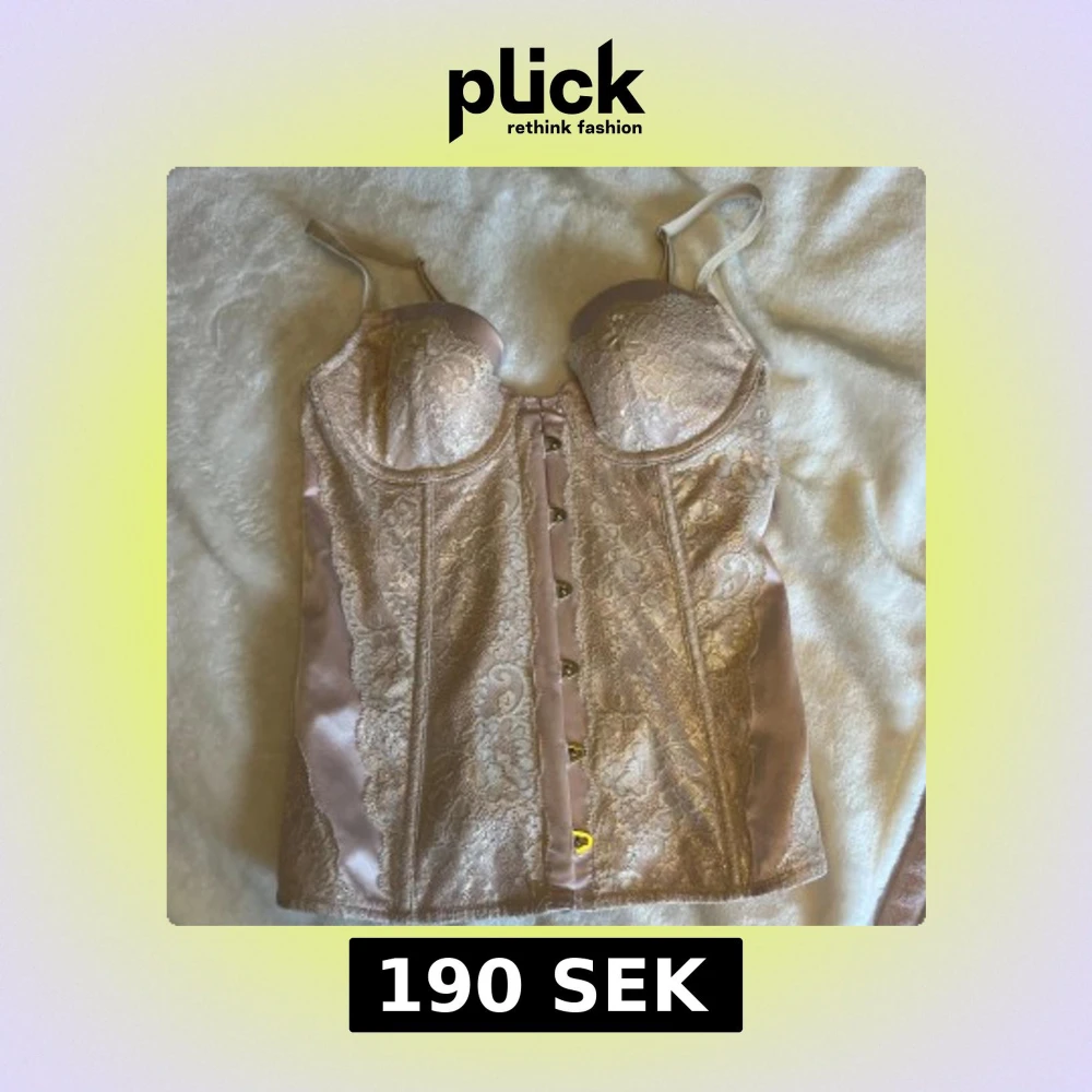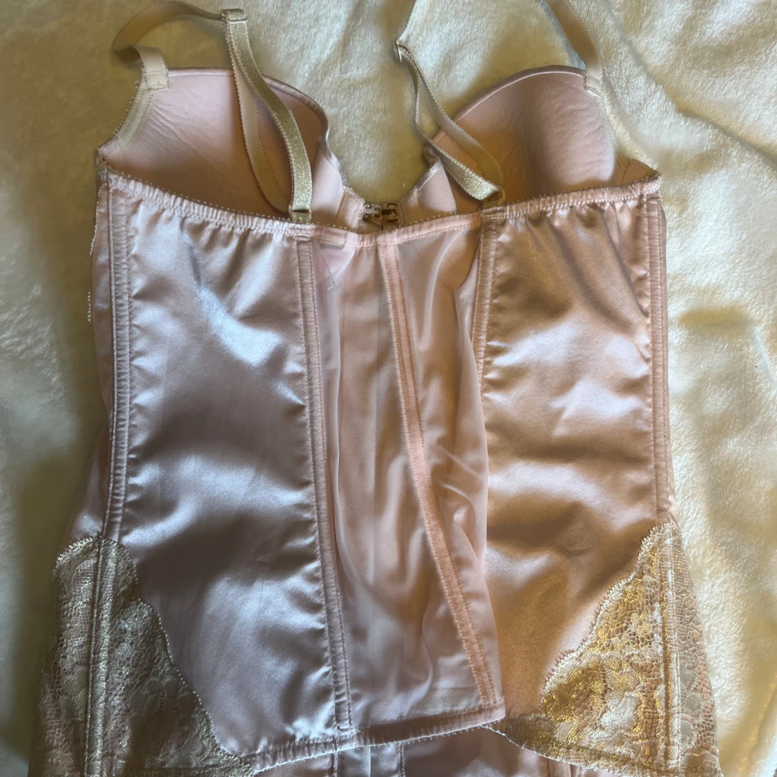 Superfin champagnefärgad korsett från Victoria's Secret med spetsdetaljer och satinpaneler. Den har bygelkupor, justerbara axelband och snygga hyskor framtill. Perfekt för dig som vill ha en lyxig och feminin look.