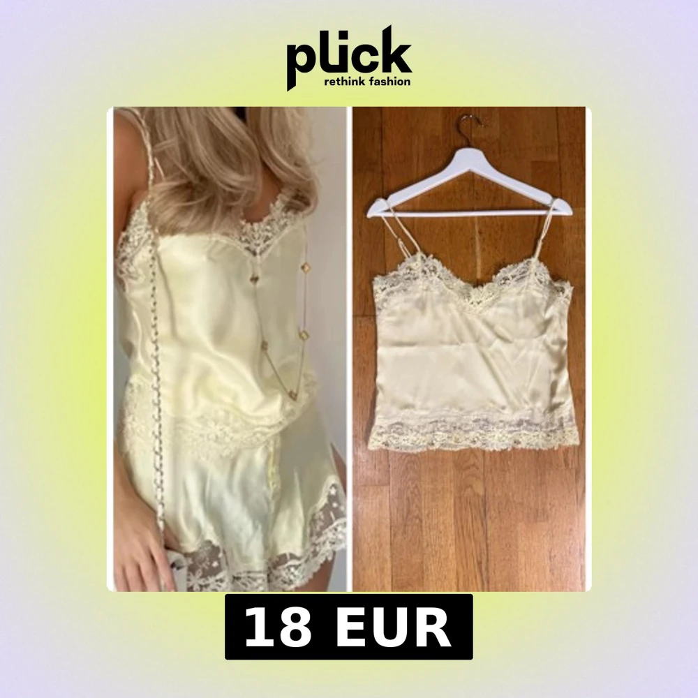 Säljer ett champagnefärgat linne i satin med tunna axelband och vacker spetsdetalj längs halsringning och nederkant. Toppen är croppad och har en mjuk, glansig finish som ger en lyxig känsla. Perfekt för dig som gillar romantiska och feminina vibes.