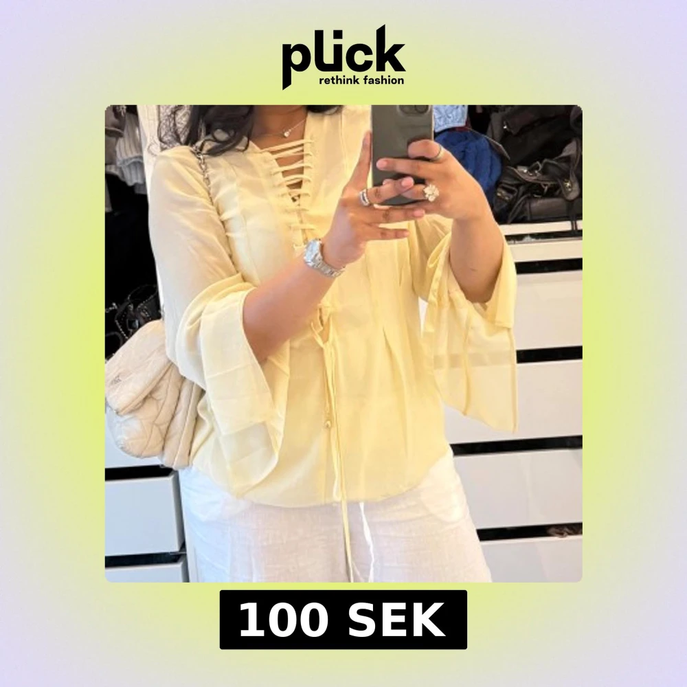Säljer en ljusgul blus med v-ringning och snygg snörning framtill. Blusen har vida, fladdriga ärmar och är gjord i ett tunt, luftigt material som känns skönt mot huden. Perfekt för dig som gillar en feminin och trendig look.