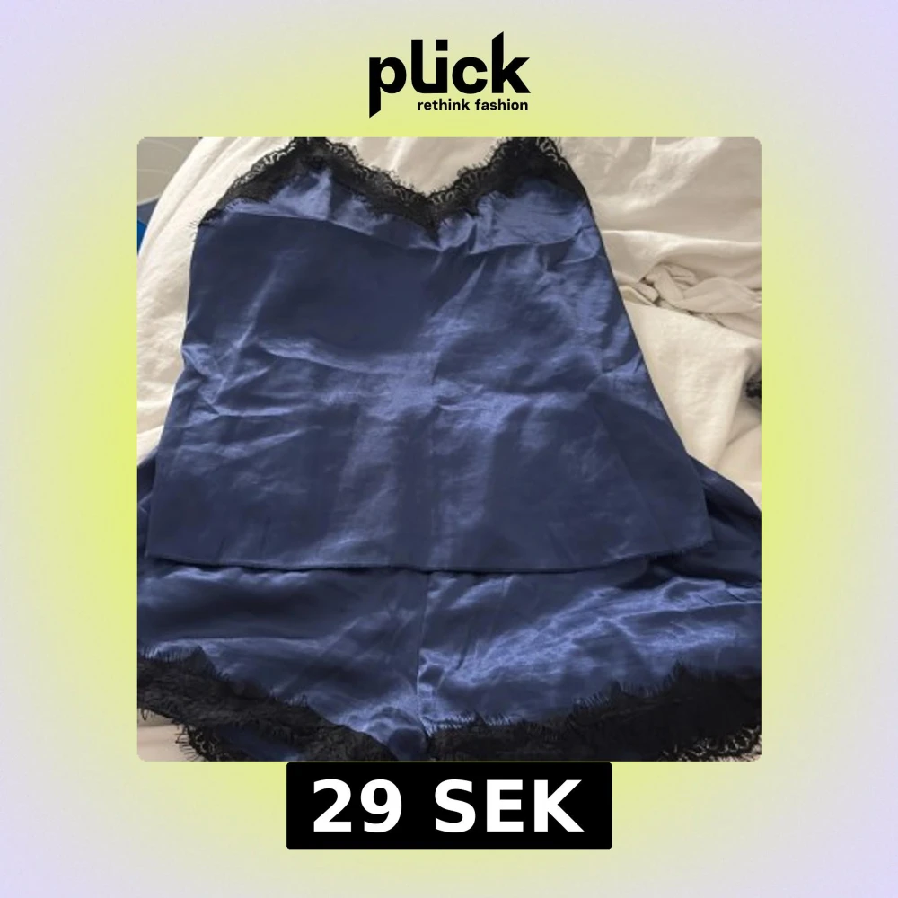 Säljer en marinblå linnetopp samt shorts i satinliknande material med tunna axelband och v-ringning dekorerad med svart spets. Toppen har en glansig finish och justerbara band för perfekt passform. Perfekt för dig som gillar en chic och elegant look. Detta sett är perfekt för en mer chill hemma look